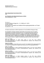 Drucksache 18 / 15 268 Schriftliche Anfrage 18. Wahlperiode Schriftliche Anfrage des Abgeordneten Frank Henkel (CDU) vom 06. Juni 2018 (Eingang beim Abgeordnetenhaus am 08. Juni 2018) zum Thema: Ankauf von Immobilien durch städtische Wohnungsbaugesellschaften von Privaten im Jahr 2017 VI und Antwort vom 22. Juni 2018 (Eingang beim Abgeordnetenhaus am 27. Juni 2018) Die Drucksachen des Abgeordnetenhauses sind bei der Kulturbuch-Verlag GmbH zu beziehen. Hausanschrift: Sprosserweg 3, 12351 Berlin-Buckow · Postanschrift: Postfach 47 04 49, 12313 Berlin, Telefon: 6 61 84 84; Telefax: 6 61 78 28.