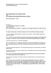Senatsverwaltung für Justiz, Verbraucherschutz und Antidiskriminierung Herrn Abgeordneten Tom Schreiber (SPD) über den Präsidenten des Abgeordnetenhauses von Berlin über Senatskanzlei - G Sen - Antwort auf die Schriftliche Anfrage Nr. 18/18984 vom 9. Mai 2019 über Linksextremismus in Berlin - Festnahme in der Rigaer Straße 94 im März 2018 (II) Im Namen des Senats von Berlin beantworte ich Ihre Schriftliche Anfrage wie folgt: 1. Hat der 41-jährige polnische Bürger M. M. (genannt „Isa“) seit dem 17.09.2018 gegen Auflagen des Gerichts verstoßen? Zu 1.: Herr M. hat nach Kenntnis des Senats nicht gegen die Auflagen des Amtsgerichts Tiergarten im Rahmen des dort erlassenen Haftverschonungsbeschlusses verstoßen. 2. Seit wann ist das Urteil vom 17.09.2018 rechtskräftig? Zu 2.: Das Urteil vom 17. September 2018 ist noch nicht rechtskräftig. Es sind Berufun- gen der Staatsanwaltschaft und der Verteidigung anhängig, die derzeit verhandelt wer- den. 3. Welche konkrete Rolle spielt M. M. in der linksextremistischen Szene und insbesondere im Umfeld der Rigaer Straße? 4. Handelt es sich bei M. M. um einen verurteilten Straf- und Gewalttäter welcher der linksextremistischen Szene zuzurechnen ist? Zu 3. und 4.: Die Fragen werden wegen vorrangiger Belange des Schutzes des allgemei- nen Persönlichkeitsrechts nicht beantwortet. 5. Was wird M. M. hinsichtlich des Vorfalls im Berliner Club „Mensch Meier“ am 30.03.2019 konkret vor- geworfen? Zu 5.: Herr M. soll am 30. März 2019 als Sicherheitsmitarbeiter des Clubs „Mensch Meier“ Mitarbeiter des Zolls, die eine Überprüfung des Clubs vornehmen wollten, sowie Polizeibeamte, die die Zollmitarbeiter begleiteten, mit Reizgas besprüht haben. Neun Personen sollen hierbei Augen- und Atemwegsreizungen erlitten haben. Die Ermittlun- gen dauern an.