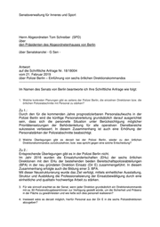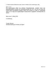 Senatsverwaltung für Inneres und Sport Herrn Abgeordneten Tom Schreiber (SPD) über den Präsidenten des Abgeordnetenhauses von Berlin über Senatskanzlei - G Sen - Antwort auf die Schriftliche Anfrage Nr. 18/18004 vom 21. Februar 2019 über Polizei Berlin – Einführung von sechs örtlichen Direktionskommandos ----------------------------------------------------------------------------------------------------------------- Im Namen des Senats von Berlin beantworte ich Ihre Schriftliche Anfrage wie folgt: 1. Welche konkreten Planungen gibt es seitens der Polizei Berlin, die einzelnen Direktionen bzw. die örtlichen Polizeiabschnitte mit Personal zu stärken? Zu 1.: Durch den für die kommenden Jahre prognostizierbaren Personalaufwuchs in der Polizei Berlin wird die künftige Personalverteilung grundsätzlich darauf ausgerichtet sein, dass sich die personelle Situation unter Berücksichtigung möglicher Prioritätensetzungen der Behördenleitung für alle operativen Dienstbereiche sukzessive verbessert. In diesem Zusammenhang ist auch eine Erhöhung der Personalstärken der Polizeiabschnitte beabsichtigt. 2. Welche Überlegungen gibt es derzeit bei der Polizei Berlin, wieder zu den örtlichen Direktionskommandos zurückzukehren, bzw. was spricht gegen eine solche Entscheidung? Zu 2.: Entsprechende Überlegungen gibt es in der Polizei Berlin nicht. Im Jahr 2016 wurden die Einsatzhundertschaften (EHu) der sechs örtlichen Direktionen mit den EHu der bestehenden beiden Bereitschaftspolizeiabteilungen (BPA) in der neu gründeten Direktion Einsatz (Dir E) zusammengeführt. In diesem Zusammenhang erfolgte auch die Bildung einer 3. BPA. Mit dieser Neustrukturierung wurde das Ziel verfolgt, mittels einheitlicher Ausstattung, Struktur und Ausbildung die Professionalisierung der Einsatzbewältigung durch eine einheitliche und qualitativ hochwertige Arbeit zu stärken. 3. Für wie sinnvoll erachtet es der Senat, wenn jeder Direktion grundsätzlich ein Direktionskommando mit ca. 60 Polizeivollzugsbeamt/innen zur Verfügung gestellt würde, um die Sicherheit und Präsenz in der Fläche zu gewährleisten und wie ließe sich dies personell realisieren? 4. Inwieweit wäre es derzeit möglich, hierfür Personal aus der Dir E in die sechs Polizeidirektionen abzugeben?