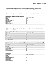 Anlage zur Antwort S18/15896 Übersicht über die Herkunftsregionen der menschlichen Überreste in den ehemaligen anthropologisch-osteologischen Sammlungen der Charité (heute SPK) Felix von Luschan-Sammlung (bis 1935 Museum für Völkerkunde, dann Friedrich-Wilhelms-Universität): S-Sammlung (Felix von Luschan-Sammlung) Kontinent Anzahl der Individuen Afrika 2009 Europa 207 Asien-Pazifik Raum 2235 Nordamerika 71 Südamerika 564 Keine Zuordnung 169 Außereuropäische Bestände der ehemaligen Sammlung des Anatomischen Instituts der Friedrich- Wilhelms-Universität Berlin: „Rasseschädelkollektion“ Kontinent Anzahl der Individuen Afrika 310 Europa 48 Asien-Pazifik Raum 263 Nordamerika 32 Südamerika 114 Keine Zuordnung 33 Überreste aus der Osteologischen Sammlung der Charité, die keiner historischen Sammlung zugeordnet werden konnten Kontinent Anzahl der Individuen Afrika 184 Europa 226 Asien-Pazifik Raum 91 Nordamerika 14 Südamerika 12 Keine Zuordnung 548 K-Sammlung Kontinent Anzahl der Individuen Afrika 6 Europa 0 Asien-Pazifik Raum 218 Nordamerika 0 Südamerika 3 Keine Zuordnung 15