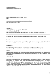 Senatsverwaltung für Stadtentwicklung und Wohnen Herrn Abgeordneten Martin Trefzer (AfD) über den Präsidenten des Abgeordnetenhauses von Berlin über Senatskanzlei - G Sen - Antwort auf die Schriftliche Anfrage Nr. 18 / 16 443 vom 10. September 2018 über Stand und Perspektiven der Entwicklung auf dem Campus für Demokratie II Im Namen des Senats von Berlin beantworte ich Ihre Schriftliche Anfrage wie folgt: Frage 1: Wie weit ist nach Kenntnisstand des Senats die Planung des Bundesbeauftragten und des Bundes für ein ‚Archiv-Zentrum SED Diktatur‘ auf dem Gelände gediehen? Antwort zu 1: Dem Senat liegen keine aktuellen Informationen zum Stand der Planung vor. Frage 2: Wie weit sind die Gespräche des Landes Berlin und der BIM mit dem Bund der BIMA über die Entwicklung des Campus für Demokratie gediehen? Was war Gegenstand der Gespräche und was ist der aktuelle Stand der Gespräche? Antwort zu 2: Der Bund – hier die Behörde der Staatsministerin für Kultur und Medien – hat in mehreren Gesprächen mit Vertretern des Landes Berlin bekräftigt, dass die Häuser 12, 13 und 14 vom Bund für die Umsetzung des Konzeptes eines Campus für Demokratie benötigt werden. Die Bundesanstalt für Immobilienaufgaben prüft gegenwärtig nach eigener Aussage die entsprechenden wirtschaftlichen Rahmenbedingungen, die auch einen möglichen Abriss der Gebäude beinhalten. 1