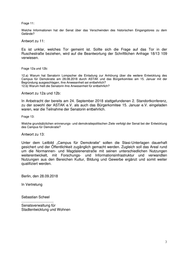 Frage 11: Welche Informationen hat der Senat über das Verschwinden des historischen Eingangstores zu dem Gelände? Antwort zu 11: Es ist unklar, welches Tor gemeint ist. Sollte sich die Frage auf das Tor in der Ruschestraße beziehen, wird auf die Beantwortung der Schriftlichen Anfrage 18/13 109 verwiesen. Frage 12a und 12b: 12.a) Warum hat Senatorin Lompscher die Einladung zur Anhörung über die weitere Entwicklung des Campus für Demokratie am 28.08.2018 durch ASTAK und das Bürgerkomitee am 15. Januar mit der Begründung ausgeschlagen, ihre Anwesenheit sei entbehrlich? 12.b) Warum hielt die Senatorin ihre Anwesenheit für entbehrlich? Antwort zu 12a und 12b: In Anbetracht der bereits am 24. September 2018 stattgefundenen 2. Standortkonferenz, zu der sowohl der ASTAK e.V. als auch das Bürgerkomitee 15. Januar e.V. eingeladen waren, war die Teilnahme der Senatorin entbehrlich. Frage 13: Welche grundsätzlichen erinnerungs- und demokratiepolitischen Ziele verfolgt der Senat bei der Entwicklung des Campus für Demokratie? Antwort zu 13: Unter dem Leitbild „Campus für Demokratie“ sollen die Stasi-Unterlagen dauerhaft gesichert und der Öffentlichkeit zugänglich gemacht werden. Zugleich soll das Areal rund um die Normannen- und Magdalenenstraße mit seinen unterschiedlichen Nutzungen weiterentwickelt, mit Forschungs- und Informationsinfrastruktur und verwandten Nutzungen aus den Bereichen Kultur, Bildung und Gewerbe ergänzt und somit weiter qualifiziert werden. Berlin, den 28.09.2018 In Vertretung Sebastian Scheel ................................ Senatsverwaltung für Stadtentwicklung und Wohnen 3