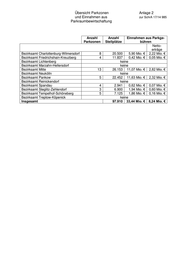 Übersicht Parkzonen Anlage 2 und Einnahmen aus zur SchrA 17/14 985 Parkraumbewirtschaftung Anzahl Anzahl Einnahmen aus Parkge- Parkzonen Stellplätze bühren Netto- erträge Bezirksamt Charlottenburg-Wilmersdorf 8 20.500 5,90 Mio. € 2,22 Mio. € Bezirksamt Friedrichshain-Kreuzberg 4 11.837 0,42 Mio. € 0,05 Mio. € Bezirksamt Lichtenberg keine Bezirksamt Marzahn-Hellersdorf keine Bezirksamt Mitte 13 26.153 11,07 Mio. € 2,82 Mio. € Bezirksamt Neukölln keine Bezirksamt Pankow 5 22.452 11,63 Mio. € 2,32 Mio. € Bezirksamt Reinickendorf keine Bezirksamt Spandau 4 2.941 0,62 Mio. € 0,07 Mio. € Bezirksamt Steglitz-Zehlendorf 3 6.900 1,94 Mio. € 0,60 Mio. € Bezirksamt Tempelhof-Schöneberg 5 7.125 1,86 Mio. € 0,16 Mio. € Bezirksamt Treptow-Köpenick keine Insgesamt 97.910 33,44 Mio. € 8,24 Mio. €