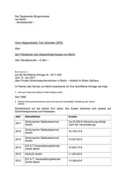 3. Wurden die Leistungen ausgeschrieben und wer war oder ist für die Ausschreibungen zuständig? Wenn nicht, warum nicht? Ja, Partner für Berlin Holding Gesellschaft für Hauptstadt-Marketing mbH. Anmerkung: Da die Partner für Berlin Holding kein öffentlicher Auftraggeber im Sinne des Gesetzes ist, wird die Leistung im Rahmen eines wettbewerblichen Verfahrens vergeben und nicht über die Vergabeplattform des Landes Berlin. 4. Wird überprüft, ob alle eingesetzten Mitarbeiterinnen und Mitarbeiter ein erweitertes polizeiliches Führungszeugnis vorgelegt haben und wenn ja, wie? Wenn nicht, warum nicht? Das beauftragte Sicherheitsunternehmen wird vertraglich zur Einhaltung des §34a Gewerbeordnung verpflichtet. Die Vorlage eines erweiterten polizeilichen Führungszeugnisses ist dagegen nicht vertraglich vereinbart und auch für die Sachkundeprüfung bei der IHK nicht erforderlich. Der kostspielige Einsatz von Mitarbeitern/-innen mit Sachkundenachweis und entsprechendem erweiterten polizeilichem Führungszeugnis führen nach Aussage von Branchenkennern nicht zu einer Erhöhung der Sicherheit während der Veranstaltung. 5. Wurden seit der Inanspruchnahme privater Sicherheitsunternehmen für das Fest fehlende erweiterte polizeiliche Führungszeugnisse festgestellt und wie wurde damit verfahren? Entfällt, da ein erweitertes Führungszeugnis nicht gefordert wird. 6. Wie hoch waren die Kosten für den Personaleinsatz in den letzten zehn Jahren bis heute? Aufstellung nach Jahren und Einsatz von Sicherheitspersonal erbeten. Siehe Übersicht unter 2. 7. Wie regelmäßig und mit welchen Ergebnissen wird überprüft, ob alle Mitarbeiterinnen und Mitarbeiter die gesetzlichen Vorgaben für die Tätigkeit im Sicherheitsbereich nach Gewerbeordnung §34a einhalten? Da bisher keine Indizien oder Leistungsmängel vorlagen, die eine Überprüfung notwendig gemacht haben, und es sich um eine eintägige Veranstaltung handelt, wurden Überprüfungen nicht vorgenommen. 8. Wie und mit welchen Ergebnissen wurde die die Einhaltung des gesetzlichen Mindestlohns und des Landesmindestlohngesetzes bei den Leistungen durch private Sicherheitsunternehmen beim Hoffest überprüft? Der Bieter bestätigt im Rahmen der Erklärung „Zuverlässigkeit und Gesetzestreue“ die Einhaltung der landesrechtlichen Vorgaben und zusätzlich werden die im Angebot gemachten Stundensätze auf Plausibilität geprüft. Berlin, den 12.07.2017 Michael Müller Regierender Bürgermeister