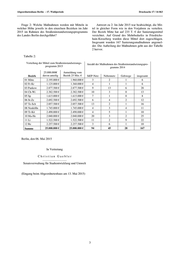 Drucksache 17 / 16 063 Schriftliche Anfrage 17. Wahlperiode Schriftliche Anfrage des Abgeordneten Joschka Langenbrinck (SPD) vom 04. April 2015 (Eingang beim Abgeordnetenhaus am 27. April 2015) und Antwort Straßensanierungsprogramm in den Bezirken Im Namen des Senats von Berlin beantworte ich Ihre In dem Doppelhaushalt 2012/2013 waren die Mittel Schriftliche Anfrage wie folgt: für die Straßensanierungsprogramme bei der Senatsver- waltung für Finanzen etatisiert. Die Steuerung des Pro- Bei über 1000 Einzelmaßnahmen würde ihre Auflis- gramms erfolgte mit der Senatsverwaltung für Stadtent- tung den Rahmen einer Schriftlichen Anfrage überschrei- wicklung und Umwelt. ten. Deshalb erfolgt die tabellarische Darstellung nach Bezirken. Im Jahr 2012 konnten infolge des späten Haushaltsbe- schlusses „nur“ 95 Sanierungsmaßnahmen mit einem Frage 1: Welche Maßnahmen wurden mit Mitteln in Volumen von 13,3 Mio. € ausgeführt werden. Von der welcher Höhe jeweils in den einzelnen Bezirken und in Senatsverwaltung für Finanzen wurden 11,7 Mio. € für 68 den einzelnen Jahren seit Bestehen des Straßeninstandset- angemeldete Straßeninstandsetzungen in das Jahr 2013 zungsprogramms des Landes Berlin durchgeführt? übertragen (siehe Tabelle 1) Antwort zu 1: In den Jahren 2010 bis 2015 wurden In den Jahren 2010 bis 2013 wurden ausschließlich jährlich 25. Mio. € für die Straßeninstandsetzung als Son- Fahrbahnsanierungen durchgeführt. derprogramm bereitgestellt. Die Verteilung der Mittel erfolgt nach dem Anteil der Bezirke am Berliner Straßen- Im Doppelhaushalt 2014/2015 sind die Mittel bei der land. Die Mittel wurden den bezirklichen Tiefbauäm- Senatsverwaltung für Stadtentwicklung und Umwelt im tern/Straßen- und Grünflächenämtern zur auftragsweisen Kapitel 1255 Titel 52130 Sonderprogramm Straßensanie- Bewirtschaftung übertragen (siehe Tabelle 1 und 2). rung eingestellt. In den Jahren 2014 und 2015 wurden von der Senatsverwaltung für Stadtentwicklung und Umwelt In den Jahren 2010 und 2011 wurden die Mittel in auch Sanierungsarbeiten im Gehwegbereich zugelassen. zwei Stufen bereitgestellt. In Stufe 1 wurden ausschließ- lich Fahrbahnen von Straßen des Hauptstraßennetzes 1 gemäß StEP -Verkehr saniert und es erfolgte die Steue- rung durch die Senatsverwaltung für Stadtentwicklung und Umwelt in Zusammenarbeit mit den bezirklichen Tiefbauämtern. In der Stufe 2 konnten die Bezirke selbst entscheiden in welchen Straßen Fahrbahnsanierungen ausgeführt werden (siehe Tabelle 1). 1 Stadtentwicklungsplan Die Drucksachen des Abgeordnetenhauses sind bei der Kulturbuch-Verlag GmbH zu beziehen. Hausanschrift: Sprosserweg 3, 12351 Berlin-Buckow · Postanschrift: Postfach 47 04 49, 12313 Berlin, Telefon: 6 61 84 84; Telefax: 6 61 78 28.