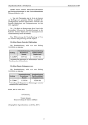Drucksache 18 / 10 189 Schriftliche Anfrage 18. Wahlperiode Schriftliche Anfrage des Abgeordneten Peter Trapp (CDU) vom 03. Januar 2017 (Eingang beim Abgeordnetenhaus am 04. Januar 2017) und Antwort Planstellen und tatsächlich Beschäftigte beim Zentralen Objektschutz (ZOS) im Jahr 2016 Im Namen des Senats von Berlin beantworte ich Ihre 2. Wie hoch war die Anzahl der tatsächlich Beschäf- Schriftliche Anfrage wie folgt: tigten (Ist-Stärke) beim Zentralen Objektschutz zum Stichtag 31. Dezember 2016, untergliedert in Beamte und 1. Wie hoch war die Anzahl der Planstellen (Soll- Angestellte: Stärke) beim Zentralen Objektschutz (ZOS) zum Stichtag a) Dir ZA ZOS 1-3 und Leitung? 31. Dezember 2016, untergliedert in Stellen für Beamte b) Dir ZA ZOS A-D? und Angestellte: a) Dir ZA ZOS 1-3 und Leitung? Zu 1. und 2.: Die Stellen- und Personalsituation stellt b) Dir ZA ZOS A-D? sich zum Stichtag 31.12.2016 wie folgt dar: (1,2) Tz.1+2 Dienststellen Beschäftigtengruppe Stellen VZÄ 2016* 2016 Beamtinnen/Beamte 17 27,00 Direktion Einsatz (Dir E) ZOS 1 -3 und Leitung Tarifbeschäftigte 6 90,87** Beamtinnen/Beamte 50*** 39,00 Dir E ZOS A - I Tarifbeschäftigte 1.506,50 1.413,20 Gesamt 1.579,50 1.570,07 * einschl. Stellen des Hauptstadtkapitels (HSK) ** ein Teil der Stellen ist noch dem Bereich ZOS A - I zugeordnet und inkl. 31 TB OS (Tarifbeschäftigte Objektschutz) im 16-wöchigen Unterweisungslehrgang an der Polizeiakademie *** inkl. 30 befristete A7/ Polizeimeisterstellen bis zur Entspannung Flüchtlingssituation (1) VZÄ = Vollzeitäquivalent (2) Angaben ohne beurlaubte Dienstkräfte Zu 3.: Die Zuordnung der Beschäftigten zum stationä- Eine differenzierte Darstellung der bei den Einheiten ren bzw. mobilen Objektschutz stellt sich zum Stichtag A - I und Sachgebieten 1 - 3 des ZOS vorhandenen Stel- 31.12.2016 wie folgt dar: len und tätigen Dienstkräften ist anhand der IPV (Inte- grierte Personalverwaltung)-Daten nicht möglich. durchschnittlich eingesetzte Stand Tarifbeschäftigte im Objekt- 31.12.2016 3. Wie viele der in der Antwort auf die Frage zu 2. schutz genannten Gesamtzahl der tatsächlich Beschäftigten beim stationäre Zentralen Objektschutz waren mit Stichtag 31. Dezember 1074 Maßnahmen 2016 jeweils dem stationären beziehungsweise dem mobi- mobile len Objektschutz zuzuordnen? 339 Maßnahmen Summe 1413 Die Drucksachen des Abgeordnetenhauses sind bei der Kulturbuch-Verlag GmbH zu beziehen. Hausanschrift: Sprosserweg 3, 12351 Berlin-Buckow · Postanschrift: Postfach 47 04 49, 12313 Berlin, Telefon: 6 61 84 84; Telefax: 6 61 78 28.