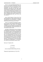 Drucksache 17 / 16 964 Schriftliche Anfrage 17. Wahlperiode Schriftliche Anfrage der Abgeordneten Katrin Lompscher (LINKE) vom 08. September 2015 (Eingang beim Abgeordnetenhaus am 09. September 2015) und Antwort Denkmalpflegerische und stadtplanerische Entwicklungen auf dem Gelände des Grauen Klosters und im Klosterviertel in Berlin-Mitte Im Namen des Senats von Berlin beantworte ich Ihre Frage 3: Wurden – wie in Drucksache 17/14703 dar- Schriftliche Anfrage wie folgt: gestellt – die Grabungen vor dem Wintereinbruch 2014/2015 verfüllt? Wenn nein, warum nicht und wann Frage 1: Inwiefern beabsichtigt der Senat, die bei der hat die Verfüllung stattgefunden? archäologischen Prospektion auf dem Gelände des Grauen Klosters bzw. des Gymnasiums zum Grauen Kloster in Antwort zu 3: Wegen der Insolvenz der archäologi- Berlin-Mitte gefundenen Bodendenkmale ganz oder teil- schen Grabungsfachfirma, die die Grabung durchführte weise unter Denkmalschutz zu stellen? und der mehrfach, wie im Falle von Leistungserbringung bei Werkverträgen üblich, Nachfristen für die Verfüllung Antwort zu 1: Das Landesdenkmalamt Berlin beab- der Grabungsflächen gesetzt wurden, erfolgte deren Ver- sichtigt die Ausweisung denkmalgeschützter Boden- füllung erst im Mai/Juni 2015 durch eine andere Firma. denkmale im Bereich des Grauen Klosters für die ergra- Vorsorglich hatte das Landesdenkmalamt Berlin im No- benen Fundamente des Kreuzgangs des Klosters und des vember 2014 mit Unterstützung von Bundesfreiwilligen Kapitelsaals. Darüber hinaus ist beabsichtigt, mit der das freiliegende Mauerwerk mit einer schützenden Sand- unter Denkmalschutz stehenden Ruine der Franziskaner- aufschüttung versehen. Mittlerweile ist der ursprüngliche klosterkirche ein Denkmalensemble auszubilden, das den Zustand der öffentlichen Grünfläche, in der die Grabung gesamten Bereich des Grauen Klosters, der als archäolo- durchgeführt wurde, wiederhergestellt. gisches Verdachtsgebiet ausgewiesen ist, einschließt. Frage 4: Welche Beeinträchtigungen und Schädigun- Frage 2: Der Senat meinte gemäß Antwort zu Frage 4 gen der Bodendenkmalstrukturen sind nach dem zurück- der Drucksache 17/14703 eine regelmäßige und öffentli- liegenden Winter eingetreten und wie werden diese ggf. che Begehbarkeit der vorübergehend freiliegenden Gra- behoben? bungen aus Kostengründen nicht einrichten zu können – warum hatte die (Fach)Öffentlichkeit jedoch überhaupt Antwort zu 4: Das Landesdenkmalamt Berlin hat die keine Möglichkeit, die vom Landesdenkmalamt freigeleg- Verfüllung der Grabungsflächen begleitet, dabei, sicher- ten Bodendenkmalstrukturen des Grauen Klosters bzw. lich auch aufgrund des milden Winters 2014/15, keinerlei des Gymnasiums zum Grauen Kloster zu besichtigen? zusätzliche Schäden am Mauerwerk festgestellt, so dass keine zusätzlichen Sicherungsmaßnahmen erforderlich Antwort zu 2: Das Landesdenkmalamt Berlin ermög- waren. lichte auf Nachfrage eine Reihe von Grabungsführungen. Beispielsweise wurden am Tag des offenen Denkmals am 13.09.2014 die Stiftung Berlinisches Gymnasium zum Frage 5: Welche Möglichkeiten bestehen für die Öf- Grauen Kloster und der Förderverein des Evangelischen fentlichkeit, die geborgenen mobilen Funde in Augen- Gymnasiums zum Grauen Kloster - Berlinisches Gymna- schein zu nehmen bzw. welche sind in welchen Zeiträu- sium in Berlin-Mitte e.V. mit insgesamt ca. 50 Personen men geplant? geführt. Am 25.09.2014 wurden die ehrenamtlichen Bo- dendenkmalpfleger Berlins, insgesamt ca. 20 Personen, geführt. Die Drucksachen des Abgeordnetenhauses sind bei der Kulturbuch-Verlag GmbH zu beziehen. Hausanschrift: Sprosserweg 3, 12351 Berlin-Buckow · Postanschrift: Postfach 47 04 49, 12313 Berlin, Telefon: 6 61 84 84; Telefax: 6 61 78 28.