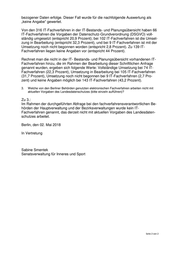 bezogener Daten erfolge. Dieser Fall wurde für die nachfolgende Auswertung als „keine Angabe“ gewertet. Von den 316 IT-Fachverfahren in der IT-Bestands- und Planungsübersicht haben 66 IT-Fachverfahren die Vorgaben der Datenschutz-Grundverordnung (DSGVO) voll- ständig umgesetzt (entspricht 20,9 Prozent); bei 102 IT-Fachverfahren ist die Umset- zung in Bearbeitung (entspricht 32,3 Prozent), und bei 9 IT-Fachverfahren ist mit der Umsetzung noch nicht begonnen worden (entspricht 2,8 Prozent). Zu 139 IT- Fachverfahren liegen keine Angaben vor (entspricht 44 Prozent). Rechnet man die nicht in der IT- Bestands- und Planungsübersicht vorhandenen IT- Fachverfahren hinzu, die im Rahmen der Bearbeitung dieser Schriftlichen Anfrage genannt wurden, ergeben sich folgende Werte: Vollständige Umsetzung bei 74 IT- Fachverfahren (22,3 Prozent), Umsetzung in Bearbeitung bei 105 IT-Fachverfahren (31,7 Prozent), Umsetzung noch nicht begonnen bei 9 IT-Fachverfahren (2,7 Pro- zent) und keine Angaben möglich bei 143 IT-Fachverfahren (43,2 Prozent). 3. Welche von den Berliner Behörden genutzten elektronischen Fachverfahren arbeiten nicht mit aktuellen Vorgaben des Landesdatenschutzes (bitte einzeln aufführen)? Zu 3.: Im Rahmen der durchgeführten Abfrage bei den fachverfahrensverantwortlichen Be- hörden der Hauptverwaltung und der Bezirksverwaltungen wurde kein IT- Fachverfahren genannt, das derzeit nicht mit aktuellen Vorgaben des Landesdaten- schutzes arbeitet. Berlin, den 02. Mai 2018 In Vertretung Sabine Smentek Senatsverwaltung für Inneres und Sport Seite 2 von 2