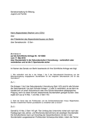 Drucksache 18 / 15 083 Schriftliche Anfrage 18. Wahlperiode Schriftliche Anfrage des Abgeordneten Stephan Lenz (CDU) vom 17. Mai 2018 (Eingang beim Abgeordnetenhaus am 22. Mai 2018) zum Thema: Stundentafel in der Sekundarstufe-I-Verordnung – verbindlich oder veränderbar und ist die 3. Sportstunde sicher? und Antwort vom 08. Juni 2018 (Eingang beim Abgeordnetenhaus am 12. Jun. 2018) Die Drucksachen des Abgeordnetenhauses sind bei der Kulturbuch-Verlag GmbH zu beziehen. Hausanschrift: Sprosserweg 3, 12351 Berlin-Buckow · Postanschrift: Postfach 47 04 49, 12313 Berlin, Telefon: 6 61 84 84; Telefax: 6 61 78 28.