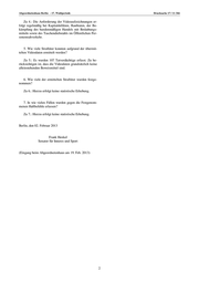 Drucksache 17 / 11 366 Kleine Anfrage 17. Wahlperiode Kleine Anfrage des Abgeordneten Peter Trapp (CDU) vom 18. Dezember 2012 (Eingang beim Abgeordnetenhaus am 19. Dezember 2012) und Antwort Aufklärung von Straftaten mit Hilfe der Videoüberwachung im öffentlichen Personennahverkehr 2011 (hier: BVG) Im Namen des Senats von Berlin beantworte ich Ihre 2. In wie vielen Fällen konnten Videodaten übermit- Kleine Anfrage wie folgt: telt werden (bitte unterteilt nach Quartalen sowie Bahnhö- fen, U-Bahnfahrzeugen, Bussen, Trams, ggf. Haltestel- Vorbemerkung: Die Kleine Anfrage betrifft auch len)? Sachverhalte, die der Senat nicht aus eigener Zuständig- keit beantworten kann. Er ist gleichwohl bemüht, Ihnen Zu 2.: Die BVG teilt hierzu mit, dass insgesamt im eine Antwort auf Ihre Anfrage zukommen zu lassen und Jahr 2011 in insgesamt 2.986 Fällen Videodaten übermit- hat daher auch die Berliner Verkehrsbetriebe (BVG) um telt wurden, davon im eine Stellungnahme gebeten, die von dort eigenverant- wortlich erstellt und dem Senat übersandt wurde. 1. Quartal 2011 727 Die Videoaufzeichnung und Speicherung im Rahmen 2. Quartal 2011 687 der gesetzlichen Frist im Bereich der U-Bahn als Teil des 3. Quartal 2011 642 öffentlichen Personennahverkehrs Berlins erfolgt durch 4. Quartal 2011 930. die BVG. Die Polizei führt keine Videoaufzeichnung durch, es findet auch keine generelle Auswertung des von Die Zahlendifferenz ergibt sich dadurch, dass nicht al- der BVG gespeicherten Datenmaterials statt, um dabei le Videodaten an die Polizei Berlin übermittelt wurden. Straftaten festzustellen. Die Polizei fordert beim An- fangsverdacht einer Straftat, die nach den Umständen durch Videokameras der BVG aufgezeichnet worden sein 3. In wie vielen Fällen konnte den Anträgen nicht könnte, die entsprechenden Filmausschnitte als Beweis- entsprochen werden, weil die Videodaten gemäß § 31 b material zur Auswertung an. Die Beantwortung der nach- Abs. 3 a Satz 2 des Berliner Datenschutzgesetzes a.F. folgenden Fragen erfolgt unter diesem Gesichtspunkt. nach 24 Stunden gelöscht waren (bitte unterteilt nach Die Beantwortung der Fragen erfolgte unter Einbezie- Quartalen)? hung der Antworten zur Kleinen Anfrage 17/10353. Zu 3.: Hierzu teilt die BVG mit, dass im Jahr 2011 in 1. In wie vielen Fällen wurden im Jahr 2011 im insgesamt 205 Fällen den Anträgen nicht entsprochen Rahmen der Strafermittlungsarbeit Anträge mit der Bitte werden konnte, da die Frist von 24 Stunden überschritten um Videodatenübermittlung an die Berliner Verkehrsbe- war, davon im triebe (BVG) gestellt (bitte unterteilt nach Quartalen)? 1. Quartal 2011 50 2. Quartal 2011 61 Zu 1.: Die BVG teilt mit, dass im Jahr 2011 insgesamt 3. Quartal 2011 35 3.875 Anträge (davon 2.417 von der Polizei) auf Videoda- 4. Quartal 2011 59. tenübermittlung an die BVG gestellt wurden, davon im 1. Quartal 2011 961 4. Welchen Deliktsbereichen sind die Straftaten, um 2. Quartal 2011 905 deren Ermittlung es ging, zuzuordnen? 3. Quartal 2011 819 4. Quartal 2011 1.190. Die Drucksachen des Abgeordnetenhauses sind bei der Kulturbuch-Verlag GmbH zu beziehen. Hausanschrift: Sprosserweg 3, 12351 Berlin-Buckow · Postanschrift: Postfach 47 04 49, 12313 Berlin, Telefon: 6 61 84 84; Telefax: 6 61 78 28.