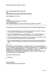 Drucksache 18 / 13 399 Schriftliche Anfrage 18. Wahlperiode Schriftliche Anfrage des Abgeordneten Peter Trapp (CDU) vom 05. Februar 2018 (Eingang beim Abgeordnetenhaus am 07. Februar 2018) zum Thema: Tarifbeschäftigte bei der Polizei, Feuerwehr und LaBO im Jahr 2017 und Antwort vom 15. Februar 2018 (Eingang beim Abgeordnetenhaus am 19. Feb. 2018) Die Drucksachen des Abgeordnetenhauses sind bei der Kulturbuch-Verlag GmbH zu beziehen. Hausanschrift: Sprosserweg 3, 12351 Berlin-Buckow · Postanschrift: Postfach 47 04 49, 12313 Berlin, Telefon: 6 61 84 84; Telefax: 6 61 78 28.