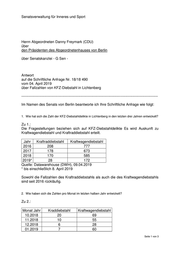 02.2019 4 39 03.2019 12 60 Quelle: DWH, 09.04.2019 3. Welche räumlichen Schwerpunkte gibt es hierbei? Zu 3.: In der Fragestellung ist nicht formuliert, auf welchen Zeitraum sich die Darstellung der Schwerpunkte beziehen soll. Es wird daher vom Abfragezeitraum der Frage 2 ausgegangen. Brennpunkte beim Kraftfahrzeugdiebstahl (Kraddiebstahl und Kraftwagendiebstahl) für den Zeitraum vom 1. Oktober 2018 bis 31. März 2019 lassen sich in den Ortsteilen Fennpfuhl, Neu-Hohenschönhausen und Friedrichsfelde feststellen. In diesen Ortsteilen sind aber keine eng umgrenzten Brennunkte ersichtlich, die Straftaten verteilen sich dort flächendeckend. 4. In wie vielen Fällen konnten Täter im Zuge der Ermittlungen gefasst werden? Zu 4.: In der Fragestellung ist nicht formuliert, auf welchen Zeitraum sich die Darstellung der Schwerpunkte beziehen soll. Es wird daher vom Abfragezeitraum der Frage 2 ausgegangen. Für den Zeitraum vom 1. Oktober 2018 bis 31. März 2019 konnten für fünf Kraftraddiebstahlstaten insgesamt neun Tatverdächtige und für 17 Kraftwagendiebstahlstaten insgesamt 17 Tatverdächtige ermittelt werden. 5. Welche Maßnahmen wurden veranlasst, um die Zahl der Delikte zu verringern? Zu 5.: In der Direktion 6 wurden seit 2016 polizeiliche Konzeptionen zur Bekämpfung des Kraftfahrzeugdiebstahls entwickelt, umgesetzt und fortlaufend der aktuellen Lage angepasst. Inhalt dieser Konzeptionen sind vorwiegend repressive, aber auch präventive Ansätze, die Grundlage für regelmäßige Schwerpunkteinsätze von Operativkräften verschiedener Polizeidienststellen der Länder Berlin und Brandenburg sind. Diese Einsätze finden lageorientiert an erkannten Brennpunkten im gesamten Gebiet der Direktion 6 statt. Weiterhin findet im Zusammenhang mit der Bekämpfung des Kraftfahrzeugdiebstahls seit Jahren kontinuierlich ein sowohl stadtweiter als auch länderübergreifender Erfahrungsaustausch zwischen den jeweiligen Fachkommissariaten statt. Darüber hinaus werden Präventionsgespräche im Rahmen polizeilicher Ermittlungen sowie Informations- und Beratungsgespräche bei Veranstaltungen, wie zum Beispiel dem Aktions- und Präventionstag der Direktion 6, dem Tag der offenen Tür der Polizei Berlin oder bei speziellen Präventionseinsätzen geführt. Auch bei kleineren Präventionsveranstaltungen oder an allgemeinen Informationsständen werden die Bürgerinnen und Bürger hinsichtlich des Themas Diebstahl von Kraftfahrzeugen sensibilisiert, sodass insgesamt das Seite 2 von 3
