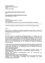 Senatsverwaltung für Stadtentwicklung und Wohnen IV B 5 Fernruf: 90139-4848 Herrn Abgeordneten Kristian Ronneburg (Linke) über den Präsidenten des Abgeordnetenhauses von Berlin über Senatskanzlei - G Sen - Antwort auf die Schriftliche Anfrage Nr. 18/15034 vom 15. Mai 2018 über Städtebauliche Entwicklung auf dem Boulevard Kastanienallee in Hellersdorf Im Namen des Senats von Berlin beantworte ich Ihre Schriftliche Anfrage wie folgt: Frage 1: Welche Ideen zur Umgestaltung des Boulevards Kastanienallee wurden bisher im Rahmen des Beteiligungsverfahrens des Quartiersmanagements vorgetragen und wie fließen diese Ideen in die weitere Umsetzung der baulichen Maßnahmen ein? Antwort zu 1: Seit 2017 findet ein umfangreiches Beteiligungsverfahren im Rahmen des vom Quartiersmanagement geförderten Projekts „Beteiligungsverfahren und Rahmenkonzept für die Gestaltung des Boulevards Kastanienallee“ (Projektträger: bwgt e.V.) mit Einbeziehung der Bewohnerschaft, der vor Ort ansässigen Einrichtungen, der aktiven Akteure und des Quartiersrates statt. Die in der Beteiligung erarbeiteten Ideen wurden von bwgt e.V. in ein Rahmenkonzept für die Umsetzung der baulichen Maßnahmen zusammengefasst. Die Schwerpunkte für die Umsetzung der baulichen Maßnahme „Boulevard Kastanienallee 1. BA“ liegen entsprechend der Prioritätensetzung des Beteiligungsverfahrens, der mehrheitlichen Nennungen bei den Befragungen sowie der Interessen der Deutsche Wohnen bei folgenden Punkten: Spiel- und Bewegungsflächen Erneuerung vorhandener Spielflächen und Ergänzung einzelner Aktions- und Bewegungsflächen für verschiedene Alters- und Zielgruppen entlang des Boulevards. Licht und Sicherheit Stärkung des subjektiven Sicherheitsgefühls durch die Verbesserung der Beleuchtungssituation. Qualifizierung und Erneuerung von Aufenthaltsflächen Aufwertung des zentralen Platzes und der Eingangssituationen des Boulevards, Schaffung attraktiver und kommunikativer Aufenthalts- und Grünflächen mit neuen identitätsstiftenden Sitzelementen. 1