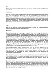 Frage 2: Welche weiteren Beteiligungsschritte werden bis zur Planung und Ausschreibung der baulichen Maßnahmen noch erfolgen? Antwort zu 2: Bis Ende Juni 2018 finden noch Workshops für unterschiedliche Zielgruppen statt. Geplant sind zwei nicht öffentliche Workshops bzgl. der Umgestaltung von Spielplätzen für Schülerinnen und Schüler der Grundschule am Schleipfuhl und Fitnessbereichen für Jugendliche und junge Erwachsene in der Jugendfreizeiteinrichtung U5 sowie ein offener Beteiligungsworkshop für Seniorenfitness mit der Zielgruppe von älteren Erwachsenen (50+). Die Termine sind zurzeit noch nicht festgesetzt, werden aber zeitnah in den Einrichtungen bzw. im Quartier bekannt gegeben. Frage 3: Wann und wie werden die konkreten baulichen Maßnahmen im Rahmen des Quartiersmanagements finalisiert? Wie wird die Öffentlichkeit dabei eingebunden? Antwort zu 3: Das Rahmenkonzept des Projektträgers bwgt e.V. bildet die Grundlage für die bauliche Umgestaltung des Boulevards Kastanienallee und wurde in der Steuerungsrunde für das Quartiersverfahren durch das Bezirksamt Marzahn-Hellersdorf, die Senatsverwaltung für Stadtentwicklung und Wohnen, die Deutsche Wohnen AG und das Quartiersmanagement Boulevard Kastanienallee bestätigt. Der Projektträger für das Baufonds-Projekt „Gestaltung Boulevard Kastanienallee inkl. Spielflächen 1. BA – Erneuerung und Qualifizierung der öffentlich genutzten Flächen“ im Rahmen des Programmes Soziale Stadt ist die GGR Wohnpark Kastanienallee GmbH. In Abstimmung mit dem Quartiersmanagement legt die Deutsche Wohnen, als Eigentümerin der öffentlich zugänglichen Fläche, die finalen Baumaßnahmen für die Umgestaltung fest. Die Ausschreibung für die Baumaßnahme findet ab August 2018 statt. Der erste Bauabschnitt wird zu gleichen Teilen durch die Deutsche Wohnen und den Baufonds des Programmes Soziale Stadt finanziert. Sollten künftige weitergehende Maßnahmen auf dem Boulevard Kastanienallee geplant werden, dient das Rahmenkonzept als Grundlage für weitere Anmeldungen für den Baufonds des Programmes Soziale Stadt 2020. Das Quartiersmanagement informiert über die Informationstafeln am Mittelpunkt (rote Holzkonstruktion vor der ehemaligen Kaufhalle am Boulevard Kastanienallee) und mit Hilfe einer schematischen Darstellung einer Zeitschiene über den weiteren Verlauf der baulichen Maßnahmen. Zusätzlich wird im quartiersbezogenen Informationsblatt „Kastanienblatt“, welches in jedem Quartal neu erscheint, über die Umgestaltung des Boulevards Kastanienallee berichtet. Aktuelle Informationen werden über die Pressemitteilungen des Bezirksamts Marzahn-Hellersdorf, die Homepage des Quartiersmanagements, die Facebook-Seite des Quartiersmanagements, bei öffentlichen Sitzungen des Quartiersrats und bei weiteren Gremiumssitzungen zur Verfügung gestellt. 2