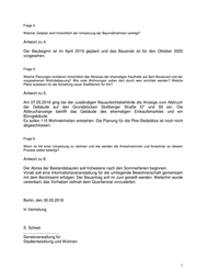 Frage 4: Welcher Zeitplan wird hinsichtlich der Umsetzung der Baumaßnahmen verfolgt? Antwort zu 4: Der Baubeginn ist im April 2019 geplant und das Bauende ist für den Oktober 2020 vorgesehen. Frage 5: Welche Planungen existieren hinsichtlich des Abrisses der ehemaligen Kaufhalle auf dem Boulevard und der vorgesehenen Wohnbebauung? Wie viele Wohnungen sollen dort durch wen errichtet werden? Welche Pläne existieren für die Schaffung neuer Stellflächen für Kfz? Antwort zu 5: Am 07.05.2018 ging bei der zuständigen Bauaufsichtsbehörde die Anzeige zum Abbruch der Gebäude auf den Grundstücken Stollberger Straße 57 und 59 ein. Die Abbruchanzeige betrifft das Gebäude des ehemaligen Einkaufsmarktes und ein Bürogebäude. Es sollen 110 Wohneinheiten entstehen. Die Planung für die Pkw-Stellplätze ist noch nicht abgeschlossen. Frage 6: Wann ist mit einer Umsetzung zu rechnen und wie werden die Anwohnerinnen und Anwohner an diesem Prozess weiter beteiligt? Antwort zu 6: Der Abriss der Bestandsbauten soll frühestens nach den Sommerferien beginnen. Vorab soll eine Informationsveranstaltung für die umliegende Bewohnerschaft gemeinsam mit dem Bezirksamt erfolgen. Der Bauantrag soll im Juni gestellt werden. Weiterhin wurde vereinbart, das Vorhaben zeitnah dem Quartiersrat vorzustellen. Berlin, den 30.05.2018 In Vertretung S. Scheel ................................ Senatsverwaltung für Stadtentwicklung und Wohnen 3