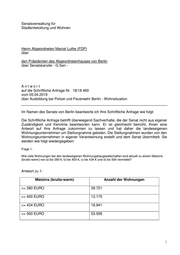 Senatsverwaltung für Stadtentwicklung und Wohnen Herrn Abgeordneten Marcel Luthe (FDP) über den Präsidenten des Abgeordnetenhauses von Berlin über Senatskanzlei - G Sen - Antwort auf die Schriftliche Anfrage Nr. 18/18 460 vom 05.04.2019 über Ausbildung bei Polizei und Feuerwehr Berlin - Wohnsituation Im Namen des Senats von Berlin beantworte ich Ihre Schriftliche Anfrage wie folgt: Die Schriftliche Anfrage betrifft überwiegend Sachverhalte, die der Senat nicht aus eigener Zuständigkeit und Kenntnis beantworten kann. Er ist gleichwohl bemüht, Ihnen eine Antwort auf Ihre Anfrage zukommen zu lassen und hat daher die landeseigenen Wohnungsunternehmen um Stellungnahme gebeten. Die Stellungnahmen wurden von den Wohnungsunternehmen in eigener Verantwortung erstellt und dem Senat übermittelt. Sie werden wie folgt wiedergegeben: Frage 1: Wie viele Wohnungen bei den landeseigenen Wohnungsbaugesellschaften sind aktuell zu einem Mietzins (brutto-warm) von a) bis 380 €, b) bis 400 €, c) bis 434 € und d) bis 500 vermietet? Antwort zu 1: Mietzins (brutto-warm) Anzahl der Wohnungen <= 380 EURO 39.721 <= 400 EURO 13.175 <= 434 EURO 18.941 <= 500 EURO 53.558 1
