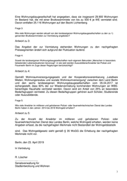 Eine Wohnungsbaugesellschaft hat angegeben, dass sie insgesamt 29.900 Wohnungen im Bestand hat, die mit einer Bruttowarmmiete von bis zu 500 € je WE vermietet sind. Davon entfallen 25.116 Wohnungen auf den Bezirk Lichtenberg. Frage 3: Wie viele Wohnungen werden aktuell von den landeseigenen Wohnungsbaugesellschaften zu den zu 1) genannten Bruttowarmmieten zur Vermietung angeboten? Antwort zu 3: Das Angebot der zur Vermietung stehenden Wohnungen zu den nachgefragten Preissegmenten ändert sich aufgrund der Fluktuation laufend. Frage 4: Soweit die landeseigenen Wohnungsbaugesellschaften nach eigenem Bekunden „Menschen in besonders belastenden Lebenssituationen bevorzugt“: in wie weit werden Auszubildene/Anwärter bei Polizei und Feuerwehr Berlin im Zuge dieser Regelungen berücksichtigt? Antwort zu 4: Gemäß Wohnraumversorgungsgesetz und der Kooperationsvereinbarung „Leistbare Mieten, Wohnungsneubau und soziale Wohnraumversorgung“ zwischen dem Land Berlin und den sechs landeseigenen Wohnungsbaugesellschaften vom 05.04.2017 ist sichergestellt, dass 60% der zur Wiedervermietung kommenden Wohnungen an WBS- berechtigte Haushalte vermietet werden. Davon wird ein Anteil von 25% an besondere Bedarfsgruppen vermietet. Zu diesen Bedarfsgruppen gehören auch Schüler, Studierende oder Auszubildende. Frage 5: Wie viele Anwärter im mittleren und gehobenen Polizei- oder feuerwehrtechnischen Dienst des Landes Berlin haben in den Jahren 2014 bis 2018 Wohngeld erhalten? Antwort zu 5: Zu der Anzahl der Anwärter im mittleren und gehobenen Polizei- oder feuerwehrtechnischen Dienst des Landes Berlin, welche Wohngeld erhalten, werden keine Angaben erfasst, da die nachgefragten Merkmale nicht Bestandteil der Wohngeldstatistik sind. Das Wohngeldgesetz sieht gemäß § 35 WoGG die Erhebung der nachgefragten Merkmale nicht vor. Berlin, den 23. April 2019 In Vertretung R. Lüscher ................................ Senatsverwaltung für Stadtentwicklung und Wohnen 3