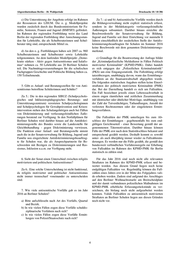 Abgeordnetenhaus Berlin – 18. Wahlperiode Drucksache 18 / 10 306 Phänomenbereichsübergreifend wurden an Berliner Schulen für das Jahr 2016 bisher fünf Fälle mit antisemitischer Motivation registriert. Diese gliedern sich auf die Quartale und Bezirke wie folgt auf: Zähldelikt Quartal Bezirk § 303 Strafgesetzbuch (StGB) - Sachbeschädigung IV Mitte § 130 StGB - Volksverhetzung IV Hellersdorf-Marzahn § 130 StGB - Volksverhetzung IV Reinickendorf § 303 StGB - Sachbeschädigung I Steglitz-Zehlendorf § 86a StGB - Verwenden von Kennzeichen II Mitte verfassungswidriger Organisationen 8. Sind dem Senat die Studien der durch das Auswär- Zu 9.: Angebote der außerschulischen Jugendbildung, tige Amt geförderten Deutsch-Israelischen Schulbuch- die sich mit dem Themenbereich Antisemitismus befas- kommission (DISBK), die sich mit dem Israelbild in deut- sen, sind Bestandteil der Programme der Berliner Jugend- schen Schulbüchern auseinandersetzen, bekannt? bildungsstätten. Häufig wird Antisemitismus dabei im Rahmen von Seminaren für Schulklassen, die sich mit a) Welche Ergebnisse werden konkret aus diesen geschichtlicher Bildung, bezogen auf den Nationalsozia- Studien abgeleitet? lismus bzw. mit Rechtsextremismus, Rassismus und b) Welche Maßnahmen werden getroffen? gruppengezogener Menschenfeindlichkeit befassen, the- matisiert. Die Behandlung von Antisemitismus ist eine Zu 8.: Ja. grundlegende Querschnittsaufgabe in allen Seminaren der außerschulischen Jugendbildung und deshalb nicht ge- Die Studie selbst liefert Ergebnisse, die Lehrkräften sondert darstellbar. Die acht Berliner Jugendbildungsstät- bekannt gemacht werden. Die Senatsverwaltung für Bil- ten erhalten eine Grundförderung sowie eine Sonderförde- dung, Jugend und Familie hat dazu aktiv einen Workshop rung für die Kooperation mit Schulen für zusammen beworben, der am 07.06.2016 im Auswärtigen Amt Berlin 29.860 Teilnahmetage. Darüber hinaus werden Gedenk- stattgefunden hat. Weiterhin beteiligt sich Berlin an einer stättenfahrten für Jugendlichengruppen i.H.v. 25.000 im Rahmen der Kultusministerkonferenz (KMK) gebilde- EUR bezuschusst. Projekte von Jugendlichen, die sich ten Arbeitsgruppe zur Erstellung von Materialien zur gegen Antisemitismus wenden, können ferner aus dem deutsch-jüdischen Geschichte. Im Fachbrief Nr. 24 für die Jugend-Demokratiefonds des Landes Berlin gefördert gesellschaftswissenschaftlichen Fächer wurden die Lehr- werden. kräfte bereits auf den ersten Teil von Materialien auf- merksam gemacht, die alternativ oder ergänzend im Un- terricht einsetzbar sind. Berlin, den 06. Februar 2017 9. Welche Maßnahmen der Jugendbildung im The- In Vertretung menbereich Antisemitismus werden vom Land Berlin angeboten oder gefördert? In welcher Höhe? Mark Rackles Senatsverwaltung für Bildung, Jugend und Familie (Eingang beim Abgeordnetenhaus am 10. Feb. 2017) 5