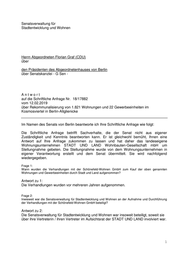 Senatsverwaltung für Stadtentwicklung und Wohnen Herrn Abgeordneten Florian Graf (CDU) über den Präsidenten des Abgeordnetenhauses von Berlin über Senatskanzlei - G Sen - Antwort auf die Schriftliche Anfrage Nr. 18/17882 vom 12.02.2019 über Rekommunalisierung von 1.821 Wohnungen und 22 Gewerbeeinheiten im Kosmosviertel in Berlin-Altglienicke Im Namen des Senats von Berlin beantworte ich Ihre Schriftliche Anfrage wie folgt: Die Schriftliche Anfrage betrifft Sachverhalte, die der Senat nicht aus eigener Zuständigkeit und Kenntnis beantworten kann. Er ist gleichwohl bemüht, Ihnen eine Antwort auf Ihre Anfrage zukommen zu lassen und hat daher das landeseigene Wohnungsunternehmen STADT UND LAND Wohnbauten-Gesellschaft mbH um Stellungnahme gebeten. Die Stellungnahme wurde von dem Wohnungsunternehmen in eigener Verantwortung erstellt und dem Senat übermittelt. Sie wird nachfolgend wiedergegeben. Frage 1: Wann wurden die Verhandlungen mit der Schönefeld-Wohnen GmbH zum Kauf der oben genannten Wohnungen und Gewerbeeinheiten durch Stadt und Land aufgenommen? Antwort zu 1: Die Verhandlungen wurden vor mehreren Jahren aufgenommen. Frage 2: Inwieweit war die Senatsverwaltung für Stadtentwicklung und Wohnen an der Aufnahme und Durchführung der Verhandlungen mit der Schönefeld-Wohnen GmbH beteiligt? Antwort zu 2: Die Senatsverwaltung für Stadtentwicklung und Wohnen war insoweit beteiligt, soweit sie über ihre Vertreterin / ihren Vertreter im Aufsichtsrat der STADT UND LAND involviert war. 1