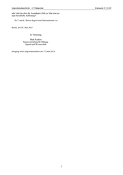 Drucksache 17 / 11 947 Kleine Anfrage 17.17. Wahlperiode Kleine Anfrage des Abgeordneten Stefan Schlede (CDU) vom 23. April 2013 (Eingang beim Abgeordnetenhaus am 24. April 2013) und Antwort Wie viele in Berlin gemeldete einschulungspflichtige Kinder kommen gar nicht erst in den Berliner Schulen an? Im Namen des Senats von Berlin beantworte ich Ihre erfolgt nicht in der Senatsverwaltung für Bildung, Jugend Kleine Anfrage wie folgt: und Wissenschaft, sondern in den einzelnen Berliner Be- zirken. Eine Abfrage, Vereinheitlichung, Zusammenfüh- 1. Wie viele in Berlin gemeldete Kinder waren zu den rung und Auswertung würde den zeitlichen Rahmen der Schuljahren 2011/2012, 2012/2013 und 2013/2014 (bitte Kleinen Anfrage sprengen. genau aufgelistet/unterteilt) einschulungspflichtig? Wir erheben die Schülerinnen und Schüler im ersten 2. Wie viele dieser in Berlin gemeldeten Kinder haben Schulbesuchsjahr der Schulanfangsphase direkt an den sich tatsächlich zur Einschulung (inkl. der Rückstellun- Schulen. Wir erfragen die erstmalig Schulpflichtigen und gen) für die Schuljahre 2011/2012 und 2012/2013 rück- die zurückgestellten Schulpflichtigen, deren Werte in der gemeldet (Prozentual und in Zahlen)? folgenden Tabelle für die letzten beiden Schuljahre er- sichtlich sind. Zu 1. und 2.: Die Zuordnung der einschulungspflichti- gen Kinder aus der Berliner Bevölkerung an die Schulen 1) 2) Schulpflichtige und zurückgestellte Schulpflichtige Schulart: öffentliche Grundschulen und Integrierte Sekundarschulen mit Grundstufe Zahl der Schulpflichtigen vor dem 1. Schultag Schuljahr Insgesamt Eingeschulte Zurückgestellte absolut in % absolut in % 2011/12 24398 22139 90,7 2259 9,3 2012/13 25322 22685 89,6 2637 10,4 1) Kinder, die im jeweiligen Schuljahr erstmalig schulpflichtig sind 2) Kinder, die von der Schulpflicht befreit wurden bzw. ab Schuljahr 2012/13 Kinder, die nach $ 42 (3) SchulG zurückgestellt wurden 4. Welche Gründe/Tatsachen liegen vor, dass sich ein- 3. Mit welchen Rückmeldezahlen (inkl. der evtl. schulungspflichtige in Berlin gemeldete Kinder nicht zur Rückstellungskinder), prozentual und in Zahlen, rechnet Einschulung bzw. Rückstellung rückmelden? der Senat für das Schuljahr 2013/2014? Zu 4.: Wir erheben nur Kinder, die nach § 42 (3) Zu 3.: Im Schuljahr 2013/14 gehen wir prognostisch Schulgesetz (SchulG) zurückgestellt wurden. von 26.430 Schülerinnen und Schülern an öffentlichen Grundschulen und Grundstufen der Integrierten Sekun- 5. Was passiert, wenn sich herausstellt, dass sich diese darschulen in der neuen 1. Jahrgangsstufe aus. Dabei sind Kinder gar nicht in Berlin/Deutschland aufhalten? in dieser Zahl auch die Antragskinder und die Kinder ent- halten, die nach der Rückstellung von der Schulpflicht eingestellt wurden. Erstmalig Schulpflichtige werden nicht prognostiziert. 6. Rechnen die Bezirke bereits, bzgl. der Kinder, die zwar in Berlin/Deutschland gemeldet sind, aber sich hier nicht aufhalten, mit einem generellen Ausfall-Prozentsatz Die Drucksachen des Abgeordnetenhauses sind bei der Kulturbuch-Verlag GmbH zu beziehen. Hausanschrift: Sprosserweg 3, 12351 Berlin-Buckow · Postanschrift: Postfach 47 04 49, 12313 Berlin, Telefon: 6 61 84 84; Telefax: 6 61 78 28.