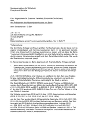 Drucksache 18 / 20 347 Schriftliche Anfrage 18. Wahlperiode Schriftliche Anfrage der Abgeordneten Susanna Kahlefeld (GRÜNE) vom 23. Juli 2019 (Eingang beim Abgeordnetenhaus am 26. Juli 2019) zum Thema: Bürgerbeteiligung an der Tourismusentwicklung über „Hier in Berlin“? und Antwort vom 07. August 2019 (Eingang beim Abgeordnetenhaus am 09. Aug. 2019) Die Drucksachen des Abgeordnetenhauses sind bei der Kulturbuch-Verlag GmbH zu beziehen. Hausanschrift: Sprosserweg 3, 12351 Berlin-Buckow · Postanschrift: Postfach 47 04 49, 12313 Berlin, Telefon: 6 61 84 84; Telefax: 6 61 78 28.