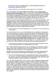 2 Alle weiteren Projekte und Maßnahmen von HIER IN BERLIN werden auf www.du-hier-in.berlin.de dargestellt. 2. Welche Anregungen aus den Werkstätten wurden aufgenommen und umgesetzt? Zu 2.: Ein Einblick in die HIER IN BERLIN-Werkstätten ist unter https://du-hier- in.berlin/hier-berlin-werkstaetten möglich. Die aus der Kreativwerkstatt entwickelten Ideen wurden von den Teilnehmerinnen und Teilnehmern bewertet und zwei Projekte zur Umsetzung ausgewählt: Die Entwicklung von fiktiven Berliner Figuren für Tipps und Hinweise an Berlin-Besucherinnen und Berlin-Besucher unter dem Projekttitel „Queen Berlin“ sowie die Idee eines Bürgerbeirats für den Berlin-Tourismus. An dem Konzept für den Bürgerbeirat (Maßnahme im Tourismuskonzept 2018+) wird gearbeitet und das Projekt "Queen Berlin" wurde bereits auf den Bezirksseiten von visitBerlin umgesetzt. Auch die HIER IN BERLIN Kiez-Tour war eine Idee in einer der Werkstätten und ist seit 2016 fester Bestandteil des Projekts. Weitere Ideen, wie z.B. FairBett, wurden nach einer anschließenden Recherche nicht weiter verfolgt, da ähn- liche Projekte oder Initiativen bereits existieren (fairbnb). 3. Welche Anregungen aus anderen Beteiligungsformen (z.B. „Kiez-Touren“) wurden aufgenommen und umgesetzt? Zu 3.: Das Ziel der Kiez-Tour ist, mit den Berlinerinnen und Berlinern ins Gespräch zum Berlin-Tourismus zu kommen, Informationen über den Wirtschaftsfaktor Touris- mus zu vermitteln sowie die Stimmungslage in den Kiezen zu eruieren. Die im Rah- men der Kiez-Tour ermittelten Ergebnisse werden transparent für die Öffentlichkeit abgebildet (https://du-hier-in.berlin/deine-meinung) und über die gesammelten Ge- sprächsthemen bei regelmäßigen Runden mit den Bezirken und beim Runden Tisch Tourismus berichtet. Hierzu auch oben unter Fragen 1., 2. – die Kiez Touren unter dem Dach von HIER IN BERLIN sind aktuell das zentrale Beteiligungselement. 4. In welchem Verhältnis stehen bei „Hier in Berlin“ die Aspekte der Bürger-Beteiligung einerseits und der Akzeptanzbeschaffung bzw. Konfliktbewältigung andererseits? Zu 4.: HIER IN BERLIN besteht derzeit aus vier strategischen Eckpfeilern: Dialog & (Bürger-)Partizipation, Marktforschung + Monitoring, Einbeziehung von Partnern + Stakeholdern, neuen Ansätzen im Tourismusmarketing. Akzeptanz soll durch die Umsetzung von Maßnahmen in allen vier Säulen erreicht werden. Hierbei spielt die Säule Dialog & Partizipation eine maßgebliche Rolle. 5. Wie wird in den Beteiligungsformaten der Unterschiedlichkeit der Bezirke Rechnung getragen (z.B. „zu viel“ vs. „zu wenig“ Tourismus) und Wünsche der Tourist*innen (z.B. Shopping vs. kultu- relle Interessen) angeht, sowie die Problematik von Privatunterkünften, Müll, Lärm und die unter- schiedlichen Angebote und Sehenswürdigkeiten der Kieze/Bezirke? Zu 5.: Die HIER IN BERLIN Kiez-Touren finden in allen zwölf Berliner Bezirken statt. Die Auswertung erfolgt pro Standort, so dass Themen pro Bezirk auswertbar sind. Hierbei werden in der Regel nicht die Aussagen von Touristinnen und Touristen er- fasst, sondern die der Berliner Bevölkerung. Erkenntnisse zu Wünschen von Touris- tinnen und Touristen werden im Rahmen von anderen Marktforschungsinstrumenten erhoben. In einer Marken-Studie zu den zwölf Bezirken wurden in diesem Jahr unter anderem die individuelle touristische Themeneignung und Zielgruppenansprache pro Bezirk (Erkenntnisse über die Bekanntheit und die Wahrnehmung der Berliner Bezir- ke) analysiert.