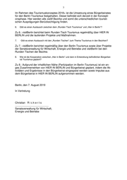 3 Im Rahmen des Tourismuskonzeptes 2018+ ist die Umsetzung eines Bürgerbeirates für den Berlin-Tourismus festgehalten. Dieser befindet sich derzeit in der Konzepti- onsphase. Hier werden alle zwölf Bezirke und somit die unterschiedlichen touristi- schen Ausprägungen Berücksichtigung finden. 6. Gibt es einen Austausch zwischen dem „Runden Tisch Tourismus“ und „Hier in Berlin“? Zu 6.: visitBerlin berichtet beim Runden Tisch Tourismus regelmäßig über HIER IN BERLIN und die laufenden Projekte und Maßnahmen. 7. Gibt es einen Austausch mit den „Runden Tischen“ zum Thema Tourismus in den Bezirken? Zu 7.: visitBerlin berichtet regelmäßig über den Berlin-Tourismus sowie über Projekte der Senatsverwaltung für Wirtschaft, Energie und Betriebe und visitBerlin bei den Runden Tischen der Bezirke. 8. Wie ist die Kooperation zwischen „Hier in Berlin“ und dem in Entwicklung befindlichen Bürgerbei- rat Tourismus geplant? Zu 8.: Aufgrund der inhaltlichen Nähe (Partizipation im Berlin-Tourismus) ist ein en- ges Zusammenwirken von HIER IN BERLIN und Bürgerbeirat geplant, indem die Ak- tivitäten und Ergebnisse in den Bürgerbeirat eingespeist werden sowie Impulse aus dem Bürgerbeirat in HIER IN BERLIN aufgenommen werden. Berlin, den 7. August 2019 In Vertretung Christian R i c k e r t s ............................................... Senatsverwaltung für Wirtschaft, Energie und Betriebe