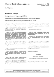Drucksache 17 / 15 471 Schriftliche Anfrage 17. Wahlperiode Schriftliche Anfrage des Abgeordneten Dr. Turgut Altug (GRÜNE) vom 04. Februar 2015 (Eingang beim Abgeordnetenhaus am 06. Februar 2015) und Antwort Urban Gardening, Roof Gardening - Fremdwörter für den Senat? Im Namen des Senats von Berlin beantworte ich Ihre Frage 4: Gibt es Untersuchungen darüber, wie groß Schriftliche Anfrage wie folgt: die potenziellen Dachflächen für Roof-Gardening- Projekte sind? Wenn, ja, wie sind die Zahlen? Wenn nein, Frage 1: Welche Strategie hat der Senat zur Entwick- warum nicht? lung der Urban-Gardening-Projekte in Berlin? Gibt es z.B. eine Vorhaltung von Flächen für die gemeinwe- Antwort zu 4: Siehe Antwort zu 3. senorientierte Nutzung? Antwort zu 1: Es gibt kein gesamtstädtisches Konzept Frage 5: In welcher Weise gedenkt der Senat, Dach- für das Thema „Urban Gardening“. Zurzeit finden Werk- flächenbegrünung generell voranzutreiben, z.B. auch aus stattgespräche mit einem offenen Teilnehmerkreis von Abkühlungsgründen? Akteurinnen und Akteuren aus dem Bereich „Urban Gar- dening“ statt - ca. dreimal jährlich. Dabei wird ein Netz- Antwort zu 5: Es gibt kein Programm zur Durchfüh- werk von Akteurinnen und Akteuren und der Austausch rung von Dachflächenbegrünung seitens des Berliner mit der Senatsverwaltung für Stadtentwicklung und Um- Senats. welt organisiert. Im Rahmen von Einzelfallprüfungen können Flächen Frage 6: Wie bewertet der Senat die zunehmende Zahl von den Bezirken zur Verfügung gestellt werden. Im von Projekten im Bereich der lokalen Lebensmittelerzeu- Übrigen wird auf die Beantwortung der Schriftlichen gung in Berlin? Anfrage Drs. 17/14433 verwiesen. Antwort zu 6: Es liegen dem Senat keine Erkenntnisse darüber vor, in welchem Umfang lokale Lebensmitteler- Frage 2: Wie sieht derzeit die Senatsförderung für sol- zeugung in Berlin entwickelt ist. che Projekte in Berlin aus? Antwort zu 2: Es erfolgt keine Förderung einzelner Berlin, den 19. Februar 2015 Projekte. Im Rahmen der Werkstattgespräche wird über die Durchführung von Urban Gardening Konzepten dis- kutiert. In Vertretung Christian Gaebler Frage 3: Wie schätzt der Senat die Möglichkeit, auf ................................ Dächern Berlins gemeinschaftlich zu gärtnern, ein? Senatsverwaltung für Stadtentwicklung und Umwelt Antwort zu 3: Die meisten Dachflächen befinden sich in Privateigentum. Die Möglichkeiten, auf diesen Flächen (Eingang beim Abgeordnetenhaus am 23. Feb. 2015) gemeinsam zu gärtnern, müssen die Eigentümerinnen und Eigentümer prüfen. Die Drucksachen des Abgeordnetenhauses sind bei der Kulturbuch-Verlag GmbH zu beziehen. Hausanschrift: Sprosserweg 3, 12351 Berlin-Buckow · Postanschrift: Postfach 47 04 49, 12313 Berlin, Telefon: 6 61 84 84; Telefax: 6 61 78 28.