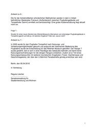 Antwort zu 6.: Die für die Verkehrsflächen erforderlichen Maßnahmen werden in dem in Arbeit befindlichen Masterplan Freiraum (Außenbereich zwischen Flughafengebäude und Tempelhofer Damm) ermittelt und berücksichtigt. Eine grobe Kostenschätzung liegt aktuell nicht vor. Frage 7.: Wurden für einen neuen Standort des AlliiertenMuseums Alternativen zum ehemaligen Flughafengebäude in Tempelhof geprüft und falls ja, mit welchem Ergebnis? Falls nein, warum nicht? Antwort zu 7.: In 2005 wurde für den Flughafen Tempelhof nach Nutzungs- und Verwertungsmöglichkeiten gesucht und aufgrund der historischen Bedeutung des Flughafens wurde die Entscheidung für das Alliierten Museum getroffen. Der Hangar 7 wurde gewählt, weil er sich in einer Randlage des Gebäudes befindet und damit keine Nutzungseinschränkungen für die übrigen Hangars entstehen. Zudem ist er Teil eines Nutzungsschwerpunkts mit weiteren touristischen Angeboten (Tower, Dachterrasse und Geschichtsgalerie), der über den U-Bahnhof Paradestraße günstig erreichbar sein wird. Berlin, den 05.04.2018 In Vertretung Regula Lüscher ................................ Senatsverwaltung für Stadtentwicklung und Wohnen 3