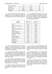 Abgeordnetenhaus Berlin – 17. Wahlperiode Drucksache 17 / 13 607 Marzahn-Hellersdorf 12.779 457.477 2,8% Lichtenberg 10.728 566.111 1,9% Reinickendorf 14.843 395.567 3,8% GESAMT 188.528 5.818.169 3,2% 4. Wie hoch war die Zuweisung für die Bezirke im Zu 4.: Der nachfolgenden Tabelle sind die den Bezir- Haushalt 2014 und 2015 für Angebote der Kinder- und ken zugewiesenen Budgets zu entnehmen, die sich in der Jugendarbeit nach § 11 SGB VIII insgesamt und bezogen Kosten- und Leistungsrechnung zusammen über die Pro- auf die einzelnen Bezirke (bitte bezirklich aufschlüsseln)? dukte „B0103 - Allgemeine Kinder- und Jugendförde- rung“ und „79877 - Erholungs- und Reisemaßnahmen“ im Bereich des Jugendamts abbilden. Bezirk Budget 2014 Budget 2015 (Werte in T€) Mitte 9.922,3 9.829,3 Friedrichshain-Kreuzberg 8.199,8 8.405,9 Pankow 9.502,9 9.253,0 Charlottenburg-Wilmersdorf 4.949,5 4.239,5 Spandau 4.988,6 4.812,7 Steglitz-Zehlendorf 5.224,3 5.056,6 Tempelhof-Schöneberg 6.709,7 6.206,1 Neukölln 7.522,1 6.677,6 Treptow-Köpenick 6.889,6 6.606,3 Marzahn-Hellersdorf 6.369,8 5.655,7 Lichtenberg 6.543,9 7.567,0 Reinickendorf 5.397,2 4.784,9 GESAMT 82.219,7 79.094,5 5. Mittel in welcher Höhe haben die Bezirke im Zu 5., 6., 7. und 8.: ie interne Verteilung der Global- Vergleich zur Zuweisungssumme für die jeweiligen summen im Rahmen der Bezirks-Haushaltspläne sowie Haushaltsjahre 2014 und 2015 tatsächlich in die bezirkli- deren Bewirtschaftung erfolgt in eigener Verantwortung chen Haushalte für die Kinder- und Jugendarbeit einge- der Bezirke. Dies gilt auch für die Aufgaben im Jugend- stellt (bitte bezirklich aufgliedern)? bereich. 6. Wie groß waren im Ergebnis der Nachschau für Der auf der Basis der Kosten- und Leistungsrechnung die Haushaltsjahre 2014 und 2015 die Differenzen zwi- berechnete Globalsummenteil (sog. Produktsummen- schen Zuweisung und tatsächlich eingestellten Mitteln für budget) ist zwar mit produktbezogenen Einzelbudgets Angebote der Kinder- und Jugendarbeit je Bezirk und unterlegt. Die Veranschlagung im Haushalt erfolgt aber insgesamt auf alle Bezirke bezogen und wie bewertet der auf kameralem Wege, so dass der gewünschte Vergleich Senat die Entwicklung? zwischen Zuweisung und Veranschlagung grundsätzlich nicht möglich ist. 7. Hat der Senat bei der Nachschau der Bezirks- haushaltspläne 2014/15 entsprechende Abweichungen der Im Rahmen der Nachschau werden die Bezirkshaus- Haushaltsansätze für Angebote der Kinder- und Jugend- haltspläne vielmehr darauf geprüft, ob z.B. die Global- arbeit „nach unten“ im Vergleich zur Zuweisung bean- summen eingehalten, die Höhe der ausgewiesenen Pau- standet und wenn nein, warum nicht? schalen zulässig, die gebildeten Ansätze realistisch sind und ob Rechtsvorschriften, Auflagen und Leitlinien be- 8. Welche Gründe sind nach Meinung des Senats achtet wurden. ausschlaggebend, wenn Bezirke weniger als zugewiesen für die Kinder- und Jugendarbeit in ihren Haushalt ein- stellen? 2