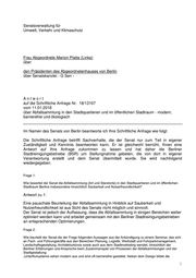 Senatsverwaltung für Umwelt, Verkehr und Klimaschutz Frau Abgeordnete Marion Platta (Linke) über den Präsidenten des Abgeordnetenhauses von Berlin über Senatskanzlei - G Sen - Antwort auf die Schriftliche Anfrage Nr. 18/13107 vom 11.01.2018 über Abfallsammlung in den Stadtquartieren und im öffentlichen Stadtraum - modern, barrierefrei und ökologisch Im Namen des Senats von Berlin beantworte ich Ihre Schriftliche Anfrage wie folgt: Die Schriftliche Anfrage betrifft Sachverhalte, die der Senat nur zum Teil in eigener Zuständigkeit und Kenntnis beantworten kann. Er ist gleichwohl bemüht, Ihnen eine Antwort auf Ihre Anfrage zukommen zu lassen und hat daher die Berliner Stadtreinigungsbetriebe (BSR) um Stellungnahme gebeten, die von dort in eigener Verantwortung erstellt und dem Senat übermittelt wurde. Sie wird nachfolgend wiedergegeben. Frage 1: Wie bewertet der Senat die Abfallsammlung (Art und Standorte) in den Stadtquartieren und im öffentlichen Stadtraum Berlins insbesondere hinsichtlich Sauberkeit und Nutzerfreundlichkeit? Antwort zu 1: Eine pauschale Beurteilung der Abfallsammlung in Hinblick auf Sauberkeit und Nutzerfreundlichkeit ist aus Sicht des Senats nicht möglich und sinnvoll. Der Senat ist jedoch der Auffassung, dass die Abfallsammlung in einigen Bereichen weiter optimiert werden kann und arbeitet gemeinsam mit den Berliner Stadtreinigungsbetrieben an entsprechenden Optimierungen. Frage 2: Wie beurteilt der Senat die der Frage folgenden Aussagen aus der Ankündigung zu einem Seminar, das sich an Fach- und Führungskräfte aus den Bereichen Planung, Logistik, Werkstatt und Fuhrparkmanagement, Landschaftsgestaltung, Architekturbüros sowie auch aus dem Stadtmarketing wendet, hinsichtlich der Berliner Erfahrungen und Ansprüche beim Zusammenspiel von Prozessen der Abfallsammlungen und der Stadtgestaltung: „Unterflursysteme sehen modern aus und sind oft barrierefrei gestaltet. Neben dem Design bildet die 1