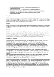- Architekturaward „Tonne Idee“ zu Müllstandplatzgestaltung und Entsorgungslösungen - Beratung von Schulen zur Abfalltrennung und Müllstandplätzen - Kooperation mit dem BDA (Bund der Architekten) Berlin als gewichtigem Multiplikator bei der baulichen Gestaltung und Umsetzung guter Entsorgungskonzepte Frage 7: Welche Regularien, insbesondere mit an ökologischen Aspekten ausgerichteten Kriterien zur Auswahl von Behältern bei der Sammlung von Wertstoffen im öffentlichen Stadtraum (z. B. seltenere Entleerungen, weniger Entsorgungsfahrzeuge, geringere Emissionen sowie Platzbedarf und Versiegelung von Flächen), gibt es in Berlin bisher? (Bitte nachvollziehbare Quellen angeben.) Frage 8: Welche Regularien zur Auswahl nutzerfreundlicher Standorte für Behälter bei der Sammlung von Wertstoffen im öffentlichen Stadtraum und auf Recyclinghöfen gibt es in Berlin bisher? (Bitte nachvollziehbare Quellen angeben.) Frage 9: Welche Regularien, insbesondere mit an ökologischen Aspekten ausgerichteten Kriterien zur Auswahl von Behältern und nutzerfreundlichen Standorten bei der Sammlung von Wertstoffen im öffentlichen Stadtraum und auf Recyclinghöfen (z. B. seltenere Entleerungen, weniger Entsorgungsfahrzeuge, geringere Emissionen sowie Platzbedarf und Versiegelung von Flächen), müssten wie geändert werden, damit sich der nutzerfreundliche und ökologische Umbau der Abfallsammelsysteme in Berlin beschleunigt? Antwort zu 7, 8 und 9: Allgemeingültige Regularien bestehen für den öffentlichen Stadtraum nicht. Es ist aus Sicht der Stadtplanung nicht auszuschließen, dass für einzelne geeignete (neue) Stadtquartiere evtl. Möglichkeiten gefunden werden können, bei den vielfältigen Ansprüchen an den öffentlichen Stadtraum (Car-, Bike-sharing, Posteinwurfsysteme, Lastenverteilsysteme (z.B. bento-boxen) oder in Zusammenhang mit Quartiersgaragen auch die Einbringung von Behältern für die Sammlung von Wertstoffen zu prüfen. Die Wertstoffsammlung im öffentlichen Straßenland (Glas, Alttextilien) findet derzeit ausschließlich durch gewerbliche Sammler bzw. karitative Einrichtungen (bei Alttextilien) statt. Die Standortgenehmigung für Altkleidercontainer nebst Auflagen erfolgt durch die Bezirke. Die Container bei der Altglassammlung werden durch die Dualen Systeme vorgegeben. Das ab 2019 in Kraft tretende Verpackungsgesetz räumt den Kommunen bei der Altglassammlung praktisch kein Gestaltungsrecht mehr ein. Die Wertstoffsammlung auf Recyclinghöfen (mehr als 20 einzelne Fraktionen) findet in der Regel in Containern statt. Im Zuge des sich in der Umsetzung befindenden Neubaus des Recyclinghofes in der Gradestraße wird zukünftig eine weitestgehend ebenerdige Entladungsmöglichkeit (über Rampe) für die Kunden angestrebt. Die Recyclinghöfe der BSR werden sukzessive mit Rollpackersystemen ausgestattet, die eine Verdichtung der Fraktionen in den Containern ermöglichen und damit erforderliche Containertausche und Transportvorgänge siginikant verringern. 5