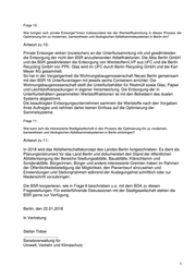 Frage 10: Wie bringen sich private Entsorger*innen insbesondere bei der Wertstoffsammlung in diesen Prozess der Optimierung hin zu modernen, barrierefreien und ökologischen Abfallsammelsystemen in Berlin ein? Antwort zu 10: Private Entsorger wirken (inzwischen) an der Unterflursammlung mit und gewährleisten die Entsorgung der nicht den BSR anzudienenden Abfallfraktionen. Die Alba Berlin GmbH und die BSR gewährleisten die Entsorgung von Wertstoffen/LVP aus UFC und die Berlin Recycling GmbH von PPK. Glas wird im UFC durch Berlin Recycling GmbH und die Karl Meyer AG gesammelt. So hat in der Vergangenheit die Wohnungsbaugenossenschaft Neues Berlin gemeinsam mit den BSR 16 Unterfluranlagen mit jeweils sechs Containern errichtet. Die Wohnungsbaugenossenschaft stellt die Unterflurbehälter für Restmüll sowie Glas, Papier und Leichtstoffverpackungen in eigener Verantwortung. Die Entsorgung der in Unterflurbehältern gesammelten Wertstofffraktionen ist mit den Betreibern des dualen Systems abgestimmt. Die beauftragten Entsorgungsunternehmen sammeln die Wertstoffe nach den Vorgaben ihres Auftrages und nehmen daher keinen Einfluss auf die Optimierung der Sammelsysteme. Frage 11: Wie kann sich die interessierte Stadtgesellschaft in den Prozess der Optimierung hin zu modernen, barrierefreien und ökologischen Abfallsammelsystemen in Berlin einbringen? Antwort zu 11: In 2018 wird das Abfallwirtschaftskonzept des Landes Berlin fortgeschrieben. Es dient als Planungsinstrument für das Land Berlin und dokumentiert den Stand der öffentlichen Abfallentsorgung der Bereiche Siedlungsabfälle, Bauabfälle, Klärschlamm und Sonderabfälle. Bürgerinnen, Bürger und andere interessierte Gremien haben im Rahmen der Öffentlichkeitsbeteiligung die Möglichkeit, den Planentwurf einzusehen und Einwendungen und Stellungnahmen während der Auslegungsfrist schriftlich oder zur Niederschrift vorzubringen. Die BSR kooperieren, wie in Frage 6 beschrieben u.a. mit dem BDA zu diesen Fragestellungen. Für weiterführende Diskussionen mit der Stadtgesellschaft stehen die BSR gerne zur Verfügung. Berlin, den 22.01.2018 In Vertretung Stefan Tidow ................................ Senatsverwaltung für Umwelt, Verkehr und Klimaschutz 6