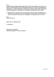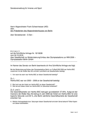 Zu 4.: Entsprechende Gesellschaftsverträge liegen der Senatsverwaltung für Inneres und Sport als Fachverwaltung und der Senatsverwaltung für Finanzen als Beteiligungs- verwaltung vor. Diese Unterlagen unterliegen der Vertraulichkeit. Über Inhalte ist im vertraulich tagenden Unterausschuss Vermögensverwaltung berichtet worden. 5. Inwieweit trifft es zu, dass auf Wunsch von Hertha BSC, beim Umbau des Olympiastadions zur WM 2006, auf die ursprünglich vom Senat vorgesehenen mobilen Tribünen verzichtet wurde, um zwecks einer besseren Vermarktung, mehr Tiefgaragen und Logenplätze bauen zu können? Zu 5.: Dies trifft nicht zu. Berlin, den 15. Oktober 2018 In Vertretung Aleksander Dzembritzki Senatsverwaltung für Inneres und Sport Seite 2 von 2