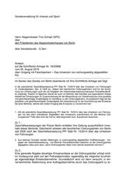 reichen, wenn ein polizeiliches Tätigwerden ressourcenbedingt zu einer zeitlichen Verzögerung führen würde. 3. Wie beurteilt der Senat, dass Polizist*innen sowohl in den Dienststellen, als auch in der Einsatzleit- zentrale und auf der Straße immer wieder zum Ausdruck bringen, dass sie nicht gleichwertig zu- ständig/verantwortlich für den ruhenden Verkehr seien, obwohl gemäß der Geschäftsanweisung (siehe Auszug oben) und Berliner Verordnung über sachliche Zuständigkeiten für die Verfolgung und Ahndung von Ordnungswidrigkeiten (ZustVO-OWiG) eine Parallelzuständigkeit besteht? Zu 3.: Grundsätzlich ist den mit Verkehrsüberwachungsaufgaben betrauten oder in der Ein- satzleitzentrale tätigen Dienstkräften die Parallelzuständigkeit im ruhenden Verkehr bekannt und bewusst. Trotzdem kann die Polizei Berlin aufgrund ihrer Alleinverant- wortung für Maßnahmen der Verkehrsunfallbekämpfung im Fließverkehr die Überwa- chung des ruhenden Verkehrs in der täglichen Verkehrssicherheitsarbeit nicht priori- sieren. 4. Inwiefern kann die Innenverwaltung in diesem Zusammenhang Einfluss auf die korrekte und ein- heitliche Arbeitsweise der Berliner Ordnungsämter nehmen? Zu 4.: Die Senatsverwaltung für Inneres und Sport hat gemäß Geschäftsverteilung des Se- nats eine Zuständigkeit ausschließlich für Grundsatzangelegenheiten der bezirkli- chen Ordnungsämter. In regelmäßigen Sitzungen werden in Anwesenheit der Senatsverwaltung für Inneres und Sport und deren koordinierender Steuerung zum einen mit den Ordnungsamts- leiterinnen und -leitern aller bezirklichen Ordnungsämter und ebenso mit den dafür zuständigen Bezirksstadträtinnen und -räten auf politischer Ebene Themen erörtert und Vorgehensweisen beschlossen. 5. Verbleibt der Durchschlag des orangenen Umsetzblocks (V 202 / Pol 801 U) für spätere Auswer- tungen bei den Berliner Ordnungsämtern? Zu 5.: Ein Durchschlag des Umsetzformulars verbleibt im Ordnungsamt. Es erfolgt jedoch keine statistische Auswertung. Das Aufbewahren der Durchschläge dient beispiels- weise zur Klärung von Nachfragen von Bürgern, der Bußgeldstelle und im Rechts- behelfsverfahren. 6. Wie bewertet der Berliner Senat den Vorschlag, im Rahmen der nächsten Ausschreibung bei Fahr- zeugen bis/ab 3,5 t jeweils mehr als ein Abschleppunternehmen für ein Stadtgebiet zu beauftragen, so dass die Abschleppwagen noch zügiger am Einsatzort erscheinen und Verkehrsbehinderungen zukünftig noch schneller beseitigt werden können? Zu 6.: Die Gebietslose und die Anzahl der geforderten Fahrzeuge wurden im Vorfeld des Vergabeverfahrens so gestaltet, dass im Regelfall das schnellstmögliche Erscheinen gewährleistet werden kann. Die Anzahl der mindestens zur Verfügung stehenden Umsetzfahrzeuge variiert je nach Größe des Gebietsloses zwischen zwei und acht Fahrzeugen. Ein Vertragsabschluss mit mehr als einem Vertragspartner für ein Gebietslos würde neben möglichen vergaberechtlichen Fragen (beispielsweise zum Modus der Auftei- Seite 2 von 4