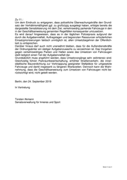 Zu 11.: Um dem Eindruck zu entgegnen, dass polizeiliche Überwachungskräfte den Grund- satz der Verhältnismäßigkeit ggf. zu großzügig ausgelegt haben, erfolgte bereits die dargestellte Sensibilisierung mit dem Ziel, verkehrswidrig parkende Fahrzeuge in den in der Geschäftsanweisung genannten Regelfällen konsequenter umzusetzen. Es wird darauf hingewiesen, dass es in der täglichen Polizeipraxis aufgrund der durch die Aufgabenvielfalt, Auftragslagen und begrenzten Ressourcen erforderlichen Einsatzpriorisierungen faktisch unmöglich ist, allen Umsetzbegehren der Öffentlich- keit zu entsprechen. Darüber hinaus darf auch nicht unerwähnt bleiben, dass für die Außendienstkräfte der Ordnungsämter ein stetiger Aufgabenzuwachs zu verzeichnen ist. Das Vorgehen gegen verkehrswidriges Parken und Halten sowie das Umsetzen von Fahrzeugen stellt lediglich einen Teil der Aufgabenvielfalt dar. Grundsätzlich muss angeführt werden, dass Umsetzvorgänge sehr zeitintensiv sind. Gleichzeitig führen Parkraumbewirtschaftung, erhöhter Straßenverkehr, die inner- städtische Bauverdichtung zur Verknappung geeigneter Stellplätze für umgesetzte Fahrzeuge und damit insgesamt zu längeren Wartezeiten. Dennoch kann die Wahr- nehmung, dass die Geschäftsanweisung zum Umsetzen von Fahrzeugen nicht be- rücksichtigt wird, nicht geteilt werden. Berlin, den 24. September 2019 In Vertretung Torsten Akmann Senatsverwaltung für Inneres und Sport Seite 4 von 4
