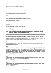 Senatsverwaltung für Kultur und Europa Herrn Abgeordneten Sebastian Czaja (FDP) über den Präsidenten des Abgeordnetenhauses von Berlin über Senatskanzlei – G Sen – Antwort auf die Schriftliche Anfrage Nr. 18 / 18705 vom 26.04.2019 über Der Flughafen Tegel (TXL) unter Denkmalschutz – Folgen und Konse- quenzen für eine mögliche Nachnutzung Im Namen des Senats von Berlin beantworte ich Ihre Schriftliche Anfrage wie folgt: 1. Welche Gutachten und externen Vergaben sind durch wen zur Vorbereitung der Ausweisung als Denkmal beauftragt worden? (bitte auflisten nach Jahr, Auftragsart, Kosten etc.) Zu 1.: Das Landesdenkmalamt Berlin hat folgende Untersuchungen, aufgelistet nach Fer- tigstellungsjahr, beauftragt: 2011 Aktenrecherche zum Untersuchungsgegenstand Flugplatz Tegel Kontinuität der Luft- fahrtgeschichte auf dem Gebiet der Jungfernheide in Berlin. Aktenrecherche zur Nut- zungs- und Baugeschichte der Luftfahrt auf dem Gebiet der Jungfernheide, insbe- sondere auf dem Gelände des heutigen TXL-Flughafens „Otto-Lilienthal“ in Tegel- Süd, Bezirk Reinickendorf von Berlin. Kosten: 11.424,00 €. 2012 Untersuchung der Denkmaleigenschaft der Gebäude des Flughafens Berlin-Tegel / Bereich Nord, Avenue Jean Mermoz, 13405 Berlin. Kosten: 13.625,00 €. 2013 Untersuchung der Denkmaleigenschaft der Gebäude des Flughafens Berlin-Tegel / Bereich Süd, 13405 Berlin. Kosten: 19.932,50 €. Seite 1 von 3