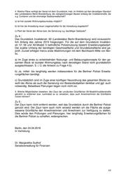 Senatsverwaltung für Finanzen Herrn Abgeordneten Marc Urbatsch (GRÜNE) über den Präsidenten des Abgeordnetenhauses von Berlin über Senatskanzlei - G Sen - Antwort auf die Schriftliche Anfrage Nr. 18/ 13998 vom 10. April 2018 über „Liegenschaft des Landes Berlin im südöstlichen Moabit“ ----------------------------------------------------------------------------------------------------------------- Im Namen des Senats von Berlin beantworte ich Ihre Schriftliche Anfrage wie folgt: Vorbemerkung: Die Fläche zwischen Invalidenstraße/ Alt-Moabit, Clara-Jaschke- Straße/ Emma-Herwegh-Straße befindet sich, mit Ausnahme der Fläche des Super- marktes, im Eigentum des Landes Berlin. Gleichwohl betrifft die Schriftliche Anfrage Sachverhalte, die der Senat nicht aus eigener Zuständigkeit und Kenntnis beantwor- ten kann. Er ist aber bemüht, Ihnen eine Antwort zukommen zu lassen und hat daher die BIM Berliner Immobilienmanagement GmbH (BIM GmbH) als Geschäftsführerin für das Sondervermögen Immobilien des Landes Berlin um Stellungnahme gebeten. Die von dort zum Standort übermittelten Angaben werden nachfolgend in ihren maß- geblichen Teilen wiedergegeben. 1. Wer ist für die Verwaltung dieses Blocks zuständig? 2. Wer ist für die Verwaltung der einzelnen Liegenschaften verantwortlich? Zu 1. und 2.: Die Grundstücke Invalidenstr. 57, 58/ Alt-Moabit 5 (Flurstücke 317/1, 614) befinden sich im Sondervermögen Immobilien des Landes Berlin (SILB). Die Verwaltung er- folgt durch die BIM Berliner Immobilienmanagement GmbH (BIM GmbH). Das Grundstück Invalidenstr. 60 (Flurstück 626) befindet sich ebenfalls im SILB und wird durch die BIM GmbH verwaltet. Das Grundstück Invalidenstr. 59 (Supermarkt) ist Privateigentum. 3. Wie werden derzeit die zweigeschossigen Bauten entlang der Invalidenstraße, die an der Emma- Herwegh-Straße aufgestellten zweigeschossigen Container und die Räume, in denen sich vormals die Staatsanwaltschaft in Alt-Moabit 5 befunden hat, genutzt? Zu 3.: Die Flächen werden derzeit als Drehscheibe für eine Baumaßnahme durch die Poli- zei genutzt. Darüber hinaus ist hier die Fahrradstaffel der Polizei untergebracht. 1/2