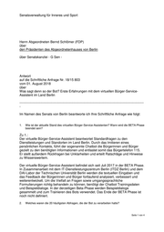 geringfügig verändert. Im Laufe der Entwicklung wurden neben den Dienstleistungen und Standorte, 1.488 Externe Dienstleistungen, 167 Themenseiten und Themencluster zur Datenbasis des virtuellen Bürger-Assistenten hinzugefügt. Zudem wurde das System um den Bereich Terminbuchung erweitert. Eine Dienstleistung besteht aus vorgefertigten Abschnitten wie z.B. Voraussetzungen, rechtliche Grundlagen, notwendige Unterlagen, Gebühren, Ort der Leistungserbringung, Anschrift, Öffnungszeiten, Zugänglichkeit (Barrierefreiheit), Zahlungsmöglichkeiten. Zu Dienstleistungen und Standorten sind jeweils mehrere Detailfragen möglich. So können für Dienstleistungen beispielsweise Gebühren und Rechtsgrundlagen beauskunftet werden; für Standorte beispielsweise Öffnungszeiten und die Erreichbarkeit mit öffentlichen Verkehrsmitteln. Darüber hinaus kann der Chatbot zu häufig gestellten 16 Themenbereichen (z.B. hinsichtlich Buchung, Änderung und Stornierung von Terminen) optimierte Auskünfte erteilen. Insgesamt ergeben sich so eine Vielzahl von möglichen Antwortkombinationen in einer Größenordnung von rund 10.000 standardisierten Antworten bzw. Antwortfragmenten. 5. Kann der virtuelle Bürger-Service-Assistent Auskünfte über politische Entscheidungsträger treffen? 6. Warum lautet die Antwort auf die Frage „Wer ist Sawsan Chebli?“ am 31. Juli 2018 immer noch „Verzeihung. Leider habe ich zu Ihrer Frage keine passende Antwort gefunden.“? Zu 5. und 6.: Der Virtuelle Bürger-Service-Assistent beantwortet ausschließlich Fragen zu den Leistungen und Standorten der Berliner Verwaltung wie z.B. Fragen zu Gebühren, Zuständigkeiten, Unterlagen die für eine Dienstleistung benötigt werden sowie Adressen, Telefonnummern und Öffnungszeiten von Behördenstandorten. Der Bürger-Service-Assistent hat keinen Zugriff auf personenbezogene Verwaltungsvorgänge oder weiterführende Informationen wie beispielsweise politischer Entscheidungsträger. Da diese Informationen nicht in strukturierter Form vorliegen, können sie nicht in die Beauskunftung mit einbezogen werden. Für Informationen zu politischen Entscheidungsträgern oder anderen nicht verwaltungsleistungsspezifische Themen bietet das Stadtportal berlin.de ein umfangreiches Informationsangebot. 7. Welche Pläne verfolgt der Senat in Bezug auf den Ausbau des neuen Online-Angebots? Und ist der Senat mit dem aktuellen Stand zufrieden? Zu 7.: Die textuellen Eingaben der Bürgerinnen und Bürger werden fortlaufend analysiert und somit die Antworten des Chatbots verbessert und weiterentwickelt. So lernt der virtuelle Bürger-Service-Assistent sukzessiv mit umgangssprachliche Formulierungen richtig umzugehen. Der größte Weiterentwicklungsbedarf wird derzeit in der Mehrsprachigkeit des Chatbots gesehen. Hierzu gibt es erste Evaluierungen der Umsetzbarkeit. Ein weiteres Ziel ist es, die Terminvereinbarung stärker zu integrieren und die Hilfestellung weiter auszubauen. Seite 3 von 4