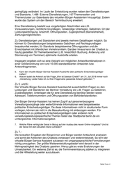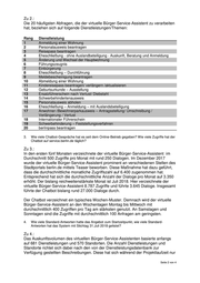 Zu 2.: Die 20 häufigsten Abfragen, die der virtuelle Bürger-Service-Assistent zu verarbeiten hat, beziehen sich auf folgende Dienstleistungen/Themen: Rang Dienstleistung 1 Anmeldung einer Wohnung 2 Personalausweis beantragen 3 Reisepass beantragen 4 Eheschließung - ohne Auslandbeteiligung - Auskunft, Beratung und Anmeldung 5 Änderung und Wechsel der Hauptwohnung 6 Führungszeugnis 7 Einbürgerung 8 Eheschließung – Durchführung 9 Meldebescheinigung beantragen 10 Abmeldung einer Wohnung 11 Kindereisepass beantragen/ verlängern /aktualisieren 12 Geburtsurkunde – Ausstellung 13 Ersatzführerschein nach Verlust/ Diebstahl 14 Schwerbehindertenausweis 15 Personalausweis abholen 16 Eheschließung – Anmeldung – mit Auslandsbeteiligung 17 Anwohner-/Bewohnerparkausweis – Antragsstellung/ Umschreibung / Verlängerung / Verlust 18 Internationaler Führerschein 19 Schwerbehinderung – Feststellungsverfahren 20 berlinpass beantragen 3. Wie viele Chatbot-Gespräche hat es seit dem Online-Betrieb gegeben? Wie viele Zugriffe hat der Chatbot auf service.berlin.de täglich? Zu 3.: In den ersten fünf Monaten verzeichnete der virtuelle Bürger-Service-Assistent im Durchschnitt 500 Zugriffe pro Monat mit rund 250 Dialogen. Im Dezember 2017 wurde der virtuelle Bürger-Service-Assistent prominent an verschiedenen Stellen des Stadtportals berlin.de mittels Teaser beworben. Diese Maßnahme hat dazu geführt, dass die durchschnittliche monatliche Zugriffszahl auf 6.400 zugenommen hat. Entsprechend hat sich die durchschnittliche Anzahl der Dialoge pro Monat auf 3.350 erhöht. Der bislang reichweitenstärkste Monat ist Juli 2018. Hier verzeichnete der virtuelle Bürger-Service-Assistent 8.787 Zugriffe und führte 3.645 Dialoge. Insgesamt führte der Chatbot bislang rund 27.000 Dialoge durch. Der Chatbot verzeichnet ein typisches Wochen-Muster. Demnach wird der virtuelle Bürger-Service-Assistent an den Wochentagen Montag bis Mittwoch mit durchschnittlich 400 Zugriffen pro Tag am stärksten genutzt. An Samstagen und Sonntagen sind die Zugriffe mit durchschnittlich 100 Anfragen am geringsten. 4. Wie viele Standard-Antworten hatte das Angebot zum Startzeitpunkt, wie viele Standard- Antworten hat das System mit Stichtag 31.Juli 2018 gelistet? Zu 4.: Das Auskunftsvolumen des virtuellen Bürger-Service-Assistenten basierte anfangs auf 681 Dienstleistungen und 570 Standorten. Die Anzahl Dienstleistungen und Standorte richtet sich dabei nach den von der Dienstleistungsdatenbank zur Verfügung gestellten Beschreibungen. Diese hat sich während der Projektlaufzeit nur Seite 2 von 4