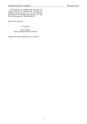 Drucksache 18 / 11 053 Schriftliche Anfrage 18. Wahlperiode Schriftliche Anfrage der Abgeordneten June Tomiak (GRÜNE) vom 20. April 2017 (Eingang beim Abgeordnetenhaus am 24. April 2017) und Antwort Identitärer Aufmarsch am 17.06.2017 Im Namen des Senats von Berlin beantworte ich Ihre In der Vergangenheit sind die Anhängerinnen und Schriftliche Anfrage wie folgt: Anhänger der Identitären Bewegung nicht durch gewalttä- tige Aktionen in Erscheinung getreten. Die im Vorfeld 1. Liegen für den 17.06.2017 Demonstrationsanmel- angemeldeten Versammlungen mit Bezug zur Identitären dungen seitens der „Identitären Bewegung“ oder Perso- Bewegung verliefen bislang störungsfrei. Eine Gewaltbe- nen, die der Bewegung nahestehen, in Berlin vor? Falls ja, reitschaft würde die von der Identitären Bewegung inten- welche Erkenntnisse hat der Senat darüber: dierte Anschlussfähigkeit an das bürgerliche Spektrum a) Wer die Demonstration(en) angemeldet hat? gefährden, weshalb sie sich um ein gewaltfreies und seri- b) Welche konkrete(n) Route(n) für die Demonstrati- öses Auftreten bemüht. Letztlich ist aber nicht gänzlich on(en) geplant ist/sind? auszuschließen, dass Anhängerinnen und Anhänger der c) Mit wie vielen Teilnehmenden seitens der Anmel- Identitären Bewegung – gegebenenfalls in von ihnen als der und seitens der Behörden gerechnet wird? Notwehrlagen dargestellten Situationen – auch zum Mittel d) Welche Materialien (Aufbauten, Lautsprecherwa- der Gewalt greifen könnten. gen etc.) jeweils angemeldet sind? e) Wie schätzt der Senat die Gewaltbereitschaft der zu erwartenden Teilnehmenden ein? 2. Welche Kenntnisse hat der Senat über die Formen der Mobilisierung für die entsprechenden Ereignisse? Zu 1. a) – e): Der Polizei Berlin liegt für den 17. Juni Bitte ausführen: 2017 eine Versammlungsanmeldung einer Einzelperson a) Wer ruft auf? im Namen der Identitären Bewegung Deutschland vor. b) Welche Zielgruppen werden angesprochen? c) Wird regional, überregional oder international mo- Die genaue Route unterliegt noch möglichen Verände- bilisiert? rungen aufgrund des Zusammenspiels von Wünschen der d) Wie schätzt der Senat die Reichweite der Mobili- anmeldenden Person, möglichen Gegenversammlungen sierungsanstrengungen ein? und polizeitaktischen Maßnahmen. Auch können weiter- gehende Angaben zum Verlauf der Versammlung erst nach Abschluss der Kooperationsgespräche und Erteilen Zu 2. a) – d): Die Demonstration wurde zuerst ohne der Versammlungsbestätigung gegeben werden. Nennung eines konkreten Datums durch ein Interview mit einem Aktivisten der Identitären Bewegung im Blog „phi- Von Seiten des Anmelders wird mit einer Teilnehmer- losophia perennis“ bekannt, die offizielle Anmeldung war zahl von 1000 Personen gerechnet. Seitens der Behörden zu diesem Zeitpunkt bereits erfolgt. Inzwischen wird über wird gegenwärtig eine Teilnehmerzahl im oberen dreistel- das Facebook-Profil der Identitären Bewegung Deutsch- ligen Bereich erwartet. land per Video und einem Posting zu der Demonstration am 17. Juni 2017 um 14.00 Uhr in Berlin mobilisiert. Der Durch den Anmelder wurde für die Aufzugsstrecke Treffpunkt wird noch nicht genannt. das Mitführen eines Kleintransporters (Pritsche) mit auf- gebauter Musikanlage angemeldet. Darüber hinaus wer- Adressaten sind Aktivisten der Identitären Bewegung den laut Anmeldung vier Banner und Fahnen (Deutsch- aus ganz Europa. Die Mobilisierung dürfte insofern inter- landfahnen, Fahnen der Identitären Bewegung) mitge- national erfolgen. führt. Die Drucksachen des Abgeordnetenhauses sind bei der Kulturbuch-Verlag GmbH zu beziehen. Hausanschrift: Sprosserweg 3, 12351 Berlin-Buckow · Postanschrift: Postfach 47 04 49, 12313 Berlin, Telefon: 6 61 84 84; Telefax: 6 61 78 28.