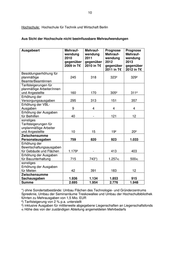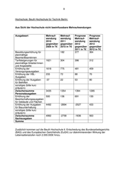 10 Hochschule: Hochschule für Technik und Wirtschaft Berlin Aus Sicht der Hochschule nicht beeinflussbare Mehraufwendungen Ausgabeart Mehrauf- Mehrauf- Prognose Prognose wendung wendung Mehrauf- Mehrauf- 2010 2011 wendung wendung gegenüber gegenüber 2012 2013 2009 in T€ 2010 in T€ gegenüber gegenüber 2011 in T€ 2012 in T€ Besoldungserhöhung für planmäßige 245 318 323² 329² Beamte/Beamtinnen Tarifsteigerungen für planmäßige Arbeiter/innen und Angestellte 160 170 305² 311² Erhöhung der Versorgungsausgaben 295 313 151 357 Erhöhung der VBL- Ausgaben 9 4 4 4 Erhöhung der Ausgaben für Beihilfen 40 - 121 12 sonstiges Tarifsteigerungen für unplanmäßige Arbeiter und Angestellte 10 15 19² 20² Zwischensumme Personalausgaben 759 820 923 1.033 Erhöhung der Bewirtschaftungsausgaben für Gebäude und Flächen 1.179³ - 413 403 Erhöhung der Ausgaben für Bauunterhaltung 715 743*) 1.2574) 5004) sonstiges Erhöhung der Ausgaben für Mieten 42 391 183 12 Zwischensumme Sachausgaben 1.936 1.134 1.853 915 Summe 2.695 1.954 2.776 1.948 *) ohne Sondertatbestände: Umbau Flächen des Technologie- und Gründerzentrums Spreeknie, Umbau der Seminarräume Treskowallee und Umbau der Hochschulbibliothek führten zu Mehrausgaben von 1,5 Mio. EUR ²) Tarifsteigerung von 2 % p.a. unterstellt ³) inklusive Ausgaben für mittlerweile abgegebene Liegenschaften an Liegenschaftsfonds 4) Höhe des von der zuständigen Abteilung angemeldeten Mehrbedarfs