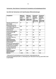 12 Hochschule: „Alice-Salomon“-Hochschule für Sozialarbeit und Sozialpädagogik Berlin Aus Sicht der Hochschule nicht beeinflussbare Mehraufwendungen Ausgabeart Mehrauf- Mehrauf- Prognose Prognose wendung wendung Mehrauf- Mehrauf- 2010 2011 wendung wendung gegenüber gegenüber 2012 2013 2009 in T€ 2010 in T€ gegenüber gegenüber 2011 in T€ 2012 in T€ Besoldungserhöhung für 37 32 35 35 planmäßige Beamte/Beamtinnen Tarifsteigerungen für 294 31 35 40 planmäßige Arbeiter/innen und Angestellte Erhöhung der 235 17 100 150 Versorgungsausgaben Erhöhung der VBL- 73 19 25 30 Ausgaben Erhöhung der Ausgaben 9 62 25 30 für Beihilfen sonstiges (bitte kurz 190* erläutern) Zwischensumme 646 161 410 285 Personalausgaben Erhöhung der 113 53 50 50 Bewirtschaftungsausgaben für Gebäude und Flächen Erhöhung der Ausgaben 271 556 100 200 für Bauunterhaltung sonstiges (bitte kurz erläutern) Zwischensumme 384 609 150 250 Sachausgaben Summe 1.030 770 560 535 * Zahlung der Grundvergütung nach der höchsten Lebensalterstufe des Bundesangestelltentarifs (BAT) zur Beseitigung der Altersdiskriminierung (siehe BAG-Urteil 6 AZR148/09)