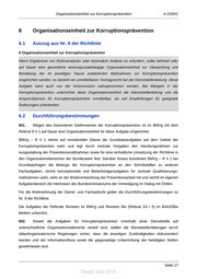 Organisationseinheit zur Korruptionsprävention 6 Organisationseinheit zur Korruptionsprävention 6.1 Auszug aus Nr. 6 der Richtlinie A-2100/1 6 Organisationseinheit zur Korruptionsprävention Wenn Ergebnisse von Risikoanalysen oder besondere Anlässe es erfordern, sollte befristet oder auf Dauer eine gesonderte weisungsunabhängige Organisationseinheit zur Überprüfung und Bündelung der im jeweiligen Hause praktizierten Maßnahmen zur Korruptionsprävention eingerichtet werden; es besteht ein unmittelbares Vortragsrecht bei der Dienststellenleitung. Diese Aufgabe kann auch von der Innenrevision wahrgenommen werden. Bei Mängeln in der Korruptionsprävention unterrichtet diese Organisationseinheit die Dienststellenleitung und die Ansprechperson für Korruptionsprävention unmittelbar; sie soll Empfehlungen für geeignete Änderungen unterbreiten. 6.2 Durchführungsbestimmungen 601. Wegen des besonderen Stellenwertes der Korruptionsprävention ist im BMVg mit dem Referat R II 1 auf Dauer eine Organisationseinheit für diese Aufgabe eingerichtet. BMVg – R II 1 nimmt auf ministerieller Ebene die Grundsatzaufgaben auf dem Gebiet der Korruptionsprävention wahr und legt durch zentrale Vorgaben den Handlungsrahmen zur Ausgestaltung der Präventionsmaßnahmen sowie für eine einheitliche Umsetzung der Richtlinie in den Organisationsbereichen der Bundeswehr fest. Darüber hinaus koordiniert BMVg – R II 1 bei Grundsatzfragen die Belange der Korruptionsprävention an den Schnittstellen zu anderen Fachaufgaben, nimmt konzeptionelle und Bedarfsträgeraufgaben für zentrale Qualifizierungs- maßnahmen wahr, wirkt an der Weiterentwicklung der Präventionsarbeit mit und vertritt im eigenen Aufgabenbereich die Interessen des Bundesministeriums der Verteidigung im Dialog mit Dritten. Für die Wahrnehmung der Dienst- und Fachaufsicht gelten die Durchführungsbestimmungen zu Nr. 9 der Richtlinie. Die Aufgaben der Referate Revision im BMVg und Revision Bw (Referat ZA I 5) im BAIUDBw bleiben unberührt. 602. Soweit die Aufgaben für Korruptionsprävention innerhalb einer Dienststelle auf unterschiedliche Organisationselemente verteilt sind, stellen die Dienststellenleitungen durch ablauforganisatorische Regelungen sicher, dass die jeweiligen Zuständigkeiten dokumentiert werden und der Informationsfluss sowie die gegenseitige Unterrichtung der beteiligten Stellen gewährleistet sind. Seite 17 Stand: Juni 2014