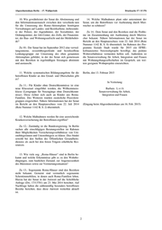 Abgeordnetenhaus Berlin – 17. Wahlperiode Drucksache 17 / 15 376 10. Wie gewährleistet der Senat die Abstimmung und 14. Welche Maßnahmen plant oder unternimmt der den Informationsaustausch zwischen den verschiede-nen Senat, um die Betroffenen vor Ausbeutung durch Miet- für die Umsetzung des Roma-Aktionsplans benötigten wucher zu schützen? Verwaltungen auf Landes- und Bezirksebene, insbesonde- re der Polizei, der Jugendämter, der Sozialämter, der Zu 14.: Dem Senat und den Bezirken sind die Proble- Ordnungsämter, der Job-Center, des Zolls, der Finanzäm- me im Zusammenhang mit Ausbeutung durch Mietwu- ter, der Bau- und Wohnungsaufsicht und der Meldebehör- cher bekannt. Nähere Informationen hat der Senat im de? Bericht an den Hauptausschuss vom 22. Juli 2014 (Rote Nummer 1142 B, S. 8) übermittelt. Im Rahmen des Pro- Zu 10.: Der Senat hat im September 2012 eine verwal- gramms Soziale Stadt wurde für 2015 ein EFRE- tungsinterne, ressortübergreifende und bezirksoffene kofinanziertes Netzwerkprojekt bewilligt, das prekäre Lenkungsgruppe zur Umsetzung des oben genannten Wohnverhältnisse vermeiden helfen soll. Außerdem ist Aktionsplans gebildet, in der der Senat sich gemeinsam die Senatsverwaltung für Arbeit, Integration und Frauen mit den Bezirken in regelmäßigen Sitzungen abstimmt mit Wohnungsbaugesellschaften im Gespräch, um wei- und austauscht. tere geeignete Wohnprojekte einzurichten. 11. Welche systematischen Bildungsangebote für die Berlin, den 13. Februar 2015 betroffenen Kinder an den Grund- und Oberschulen gibt es? In Vertretung Zu 11.: Für Kinder ohne Deutschkenntnisse ist eine neue Klassenart eingeführt worden, die Willkommens- Barbara L o t h klasse (Lerngruppe für Neuzugänge ohne Deutschkennt- Senatsverwaltung für Arbeit, nisse). Diese richtet sich auch an Kinder aus Roma- Integration und Frauen Familien. Des Weiteren wurden zusätzliche Praxislern- gruppen eingerichtet. Nähere Informationen hat der Senat im Bericht an den Hauptausschuss vom 22. Juli 2014 (Eingang beim Abgeordnetenhaus am 16. Feb. 2015) (Rote Nummer 1142 B, S. 2) übermittelt. 12. Welche Maßnahmen werden für eine ausreichende Krankenversicherung der Betroffenen ergriffen? Zu 12.: Zuständig ist die Bundesregierung. In Berlin suchen alle einschlägigen Beratungsstellen im Rahmen ihrer Möglichkeiten Versicherungsverhältnisse von Uni- onsbürgerinnen und Unionsbürgern zu klären. Dies bindet sowohl bei den Stellen des Öffentlichen Gesundheits- dienstes als auch bei den freien Trägern erhebliche Res- sourcen. 13. Wie viele sog. „Roma-Häuser“ sind in Berlin be- kannt und welche Erkenntnisse gibt es zu den Wohnbe- dingungen, zum baulichen Zustand, zur Angemessenheit des Mietzinses sowie zur Vermietungssituation? Zu 13.: Sogenannte Roma-Häuser sind den Bezirken nicht bekannt. Gemeint sind vermutlich sogenannte Schrottimmobilien, in denen auch Roma-Familien leben. Hierzu hat der Senat in der Antwort auf die Schriftliche Anfrage (Drs. 17/13701) am 23. Mai 2014 berichtet. Auf Nachfrage haben die zahlenmäßig besonders betroffenen Bezirke berichtet, dass diese Antwort weiterhin aktuell ist. 2