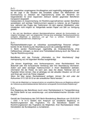 Zu 3.: Nachvollziehbar vorgetragenen Anrufbegehren wird regelmäßig stattgegeben, soweit es die Lage in der Situation des Einzelfalls zulässt. Die Maßnahmen der Durchsuchung zu Zwecken der Eigensicherung sowie der Abnahme von Gegenständen für einen begrenzten Zeitraum werden gegenüber Betroffenen transparent dargestellt. Insbesondere im Zusammenhang mit Rückführungsmaßnahmen werden Betroffene sensibilisiert, sich wichtige Telefonnummern separat zu notieren, da am Flughafen bzw. während des Fluges das Telefonieren mit dem eigenen Mobiltelefon unter Umständen nicht möglich ist. Nötigenfalls werden Papier und Stift zur Verfügung gestellt. 4. Wie wird den Betroffenen während Abschiebemaßnahmen jederzeit die Kommunikation zur möglichst frühzeitigen, sach- und zeitgerechten Führung eines einstweiligen Rechtsschutzverfahrens ermöglicht (Möglichkeit zu telefonieren und ggf. Faxe zu schicken, Erreichbarkeit von Gerichten/Rechtsanwält*innen, Zeitplanung)? Zu 4.: Rechtsbehelfsbelehrungen an vollziehbar ausreisepflichtige Personen erfolgen bereits mit der Androhung der Abschiebung durch die zuständige Behörde. In Berlin werden Rückführungen regelmäßig als Direktabschiebung ohne Haftbeschluss vollzogen, zu denen eine Freiheitsbeschränkung durch die Polizei am Tag der Rückführung erfolgt. Betroffenen wird das Formular „Information zu Ihrer Abschiebung“ (liegt mehrsprachig vor) mit folgendem Wortlaut ausgehändigt: „Sie können Angehörige, eine Vertrauensperson, einen Rechtsbeistand, Ihre Botschaft oder Ihre konsularische Vertretung über Ihre Abschiebung informieren. Sofern sich dafür benötigte Telefonnummern in Ihrem Mobiltelefon befinden, informieren Sie die Polizei. Es kann sein, dass Sie dieses Telefonat erst am Flughafen führen können. Dies ist abhängig von der aktuellen Situation vor Ort und wird Ihnen ggf. durch die Polizei mitgeteilt. Wenn Sie über keinen Rechtsbeistand verfügen, können Sie sich unter der Rufnummer 0172 325 55 53 an den anwaltlichen Notruf wenden.“ 5. Wie wird die Möglichkeit zur Inanspruchnahme von anwaltlicher Betreuung und Begleitung während der Vollstreckung aufenthaltsbeendender Maßnahmen sichergestellt (Kommunikation/Zeitplanung)? Zu 5.: Eine Begleitung des Betroffenen durch einen Rechtsbeistand im Transportfahrzeug der Polizei Berlin ist aus versicherungs- und sicherheitstechnischen Gründen nicht möglich. Gemäß der Entscheidung des OVG Berlin-Brandenburg (Beschluss vom 23.03.2018 – OVG 1 N 8.17) besteht kein Anspruch auf anwaltliche Begleitung im Rückführungsbereich des Flughafens. Für die Betroffenen besteht im Rückführungsbereich des Flughafens die Möglichkeit, ihren Rechtsbeistand mittels Diensttelefon der Bundespolizei zu kontaktieren. Seite 2 von 4