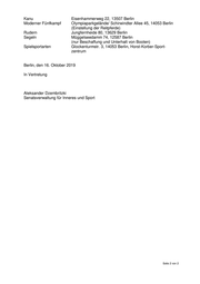 Senatsverwaltung für Inneres und Sport Herrn Abgeordneten Robert Schaddach (SPD) über den Präsidenten des Abgeordnetenhauses von Berlin über Senatskanzlei - G Sen - Antwort auf die Schriftliche Anfrage Nr. 18/21 232 vom 02.10.2019 über Förderung der Berliner Landesstützpunkte (LSP) – Nachfrage zur Drucksache 18/20 995 ----------------------------------------------------------------------------------------------------------------- Im Namen des Senats von Berlin beantworte ich Ihre Schriftliche Anfrage wie folgt: 1. Welche von den derzeit 31 Berliner Landesstützpunkten (LSP) erhalten zusätzlich zu der entgelt- freien Bereitstellung von Sportanlagen bzw. zum „Zuschuss zu den Betriebskosten bzw. für die An- mietung von Sportanlagen“ (vgl. hierzu die Beantwortung der Schriftlichen Anfrage Drucksache 18 / 20 995 zu 4.) darüber hinaus auch sportfachlich-finanzielle Mittel über den Senat und/oder den LSB Berlin e.V. und in welcher Höhe? Bitte jeweils einzeln auflisten. Zu 1.: Über die Zuschüsse zu den Betriebskosten bzw. für die Anmietung von Sportanlagen hinaus gewährt der Senat keine weiteren Mittel für die Landestützpunkte (LSP). Nach eigener Auskunft vergibt der Landessportbund Berlin, Abt. Leistungssport, gene- rell keine finanziellen Zuwendungen an LSP. Der LSB fördert die Sportarten/ Diszipli- nen über die Sportfachverbände. 2. Für welche (gedeckten/ungedeckten) Sportstätten / Liegenschaften genau übernimmt der Senat einen „Zuschuss zu den Betriebskosten bzw. für die Anmietung von Sportanlagen“ (vgl. auch hierzu die Beantwortung der Schriftlichen Anfrage Drucksache 18 / 20 995 zu 4.)? Bitte jeweils einzeln auf- listen Zu 2.: Der Senat gewährt die Zuschüsse für folgende Sportstätten/Liegenschaften: Sportart Sportstätte/Liegenschaft Bowling Bowlingcenter Schillerpark, Müllerstr. 46, 13349 Berlin und Neue City Bowling Hasenheide, Hasenheide 108, 10967 Berlin Fußball Am Kleinen Wannsee 14 und 26, 14109 Berlin Seite 1 von 2