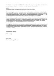4. Würde die Beendigung der Geschäftsbeziehungen des Landes und seiner nachgeordneten Behörden (inkl. der Bezirke) Kosten für das Land verursachen? Wenn ja, in welcher Höhe und warum? Zu 4.: Die Beendigung der Geschäftsbeziehungen würde Kosten verursachen. Es ist nicht möglich, zu einem bestimmten Termin ein Konto durch ein anderes zu ersetzen. Das bis dato existierende Konto wäre für einen Zeitraum, der sich voraussichtlich auf mindestens ein Jahr er- strecken würde, weiterzuführen. Somit wären u.a. Fehlzahlungen seitens des Einzahlenden, z. B. auf- grund nicht geänderter eingerichteter Daueraufträge, weitestgehend auszuschließen. Eine Umstellung würde für die Kassen einen sowohl erhöhten Arbeits- als auch Personalaufwand be- deuten. Dienststellen, die Dateien in Vorsystemen verarbeiten, wären gezwungen, die Software und die Verarbeitungsroutinen anzupassen. Gebührenbescheide, Vordrucke im Mahn- und Vollstre- ckungsverfahren usw. wären ebenfalls landesweit zu harmonisieren. Ein Wegfall der Clearingkonten würde eine manuelle Kontodisposition (Personal- Schulungsaufwand) in den Bezirkskassen und beim Zentralen Zahlungsverkehr der Finanzämter begründen und hätte Li- quiditätsverluste durch verspätete Geldeingänge zur Folge. Die Kosten zu den genannten Positionen sind nicht zu schätzen. Berlin, den 30. Juli 2018 In Vertretung Klaus Feiler Senatsverwaltung für Finanzen