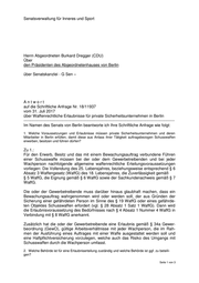 Senatsverwaltung für Inneres und Sport Herrn Abgeordneten Burkard Dregger (CDU) Über den Präsidenten des Abgeordnetenhauses von Berlin über Senatskanzlei - G Sen – Antwort auf die Schriftliche Anfrage Nr. 18/11937 vom 31. Juli 2017 über Waffenrechtliche Erlaubnisse für private Sicherheitsunternehmen in Berlin ----------------------------------------------------------------------------------------------------------------- Im Namen des Senats von Berlin beantworte ich Ihre Schriftliche Anfrage wie folgt: 1. Welche Voraussetzungen und Erlaubnisse müssen private Sicherheitsunternehmen und deren Mitarbeiter in Berlin erfüllen, damit diese aus Anlass ihrer Tätigkeit auftragsbezogen Schusswaffen erwerben, besitzen und führen dürfen? Zu 1.: Für den Erwerb, Besitz und das mit einem Bewachungsauftrag verbundene Führen einer Schusswaffe müssen bei der oder dem Gewerbetreibenden und bei jeder Wachperson nachfolgende allgemeine waffenrechtliche Erteilungsvoraussetzungen vorliegen: Die Vollendung des 25. Lebensjahres, beziehungsweise entsprechend § 6 Absatz 3 Waffengesetz (WaffG) des 18. Lebensjahres, die Zuverlässigkeit gemäß § 5 WaffG, die Eignung gemäß § 6 WaffG sowie der Sachkundenachweis gemäß § 7 WaffG. Die oder der Gewerbetreibende muss darüber hinaus glaubhaft machen, dass ein Bewachungsauftrag wahrgenommen wird oder werden soll, der aus Gründen der Sicherung einer gefährdeten Person im Sinne des § 19 WaffG oder eines gefährde- ten Objektes Schusswaffen erfordert (vgl. § 28 Absatz 1 Satz 1 WaffG). Dann wird die Erlaubnisvoraussetzung des Bedürfnisses nach § 4 Absatz 1 Nummer 4 WaffG in Verbindung mit § 8 WaffG anerkannt. Zusätzlich hat die oder der Gewerbetreibende eine Erlaubnis gemäß § 34a Gewer- beordnung (GewO), gültige Arbeitsverhältnisse mit jeder Wachperson, die im Rah- men der Ausführung eines Auftrages mit einer Waffe ausgestattet werden soll und eine Haftpflichtversicherung vorzulegen, welche auch das Risiko des Umgangs mit Schusswaffen durch die Wachperson umfasst. 2. Welche Behörde ist für eine Erlaubniserteilung zuständig und welche Behörde ist ggf. zu beteili- gen? Seite 1 von 3