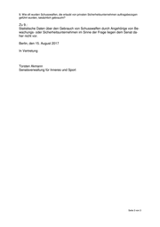 9. Wie oft wurden Schusswaffen, die erlaubt von privaten Sicherheitsunternehmen auftragsbezogen geführt wurden, tatsächlich gebraucht? Zu 9.: Statistische Daten über den Gebrauch von Schusswaffen durch Angehörige von Be- wachungs- oder Sicherheitsunternehmen im Sinne der Frage liegen dem Senat da- her nicht vor. Berlin, den 15. August 2017 In Vertretung Torsten Akmann Senatsverwaltung für Inneres und Sport Seite 3 von 3
